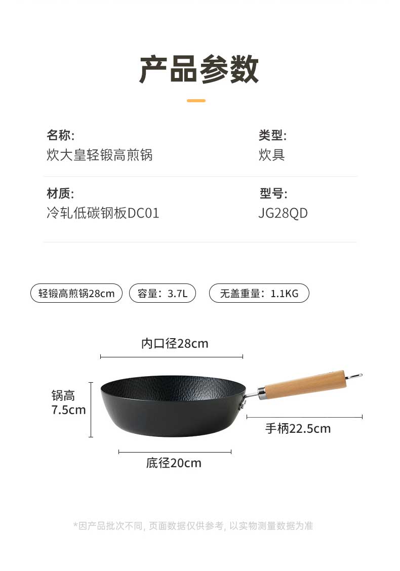 商品名称:(中合誉品)炊大皇轻锻高煎锅28CMJG28QD 精铁0涂层可用铁铲