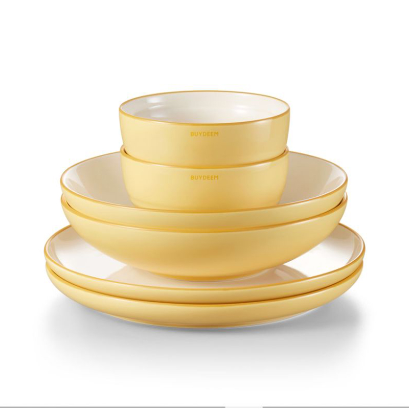 (巨邦佑)R+北鼎团圆月黄陶瓷餐具(6件)12cm碗*2&20cm深盘*2&22cm平盘*2