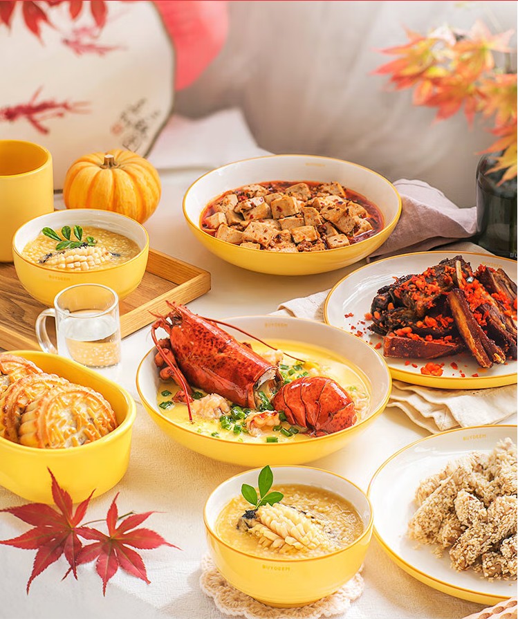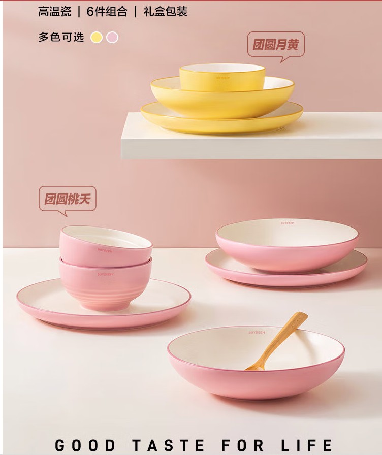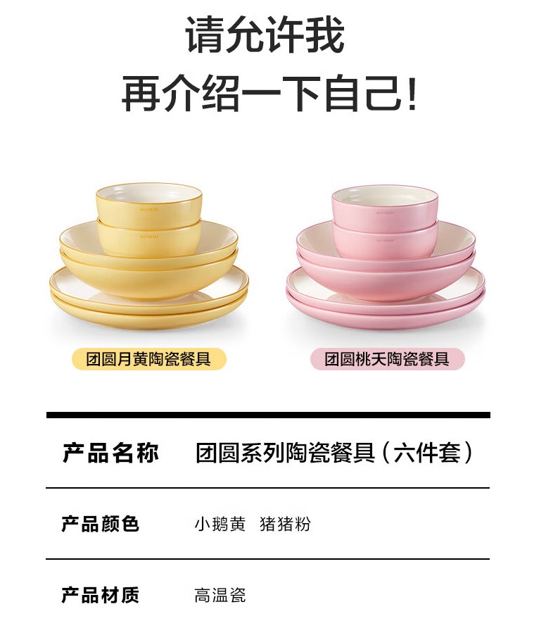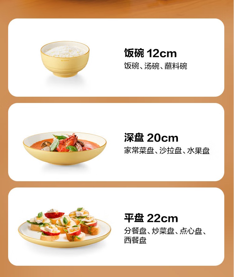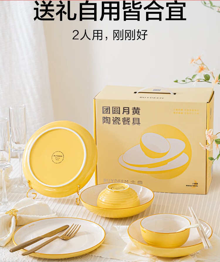 商品名称:(巨邦佑)R+北鼎团圆月黄陶瓷餐具(6件)12cm碗*2&20cm深盘*2&22cm平盘*2