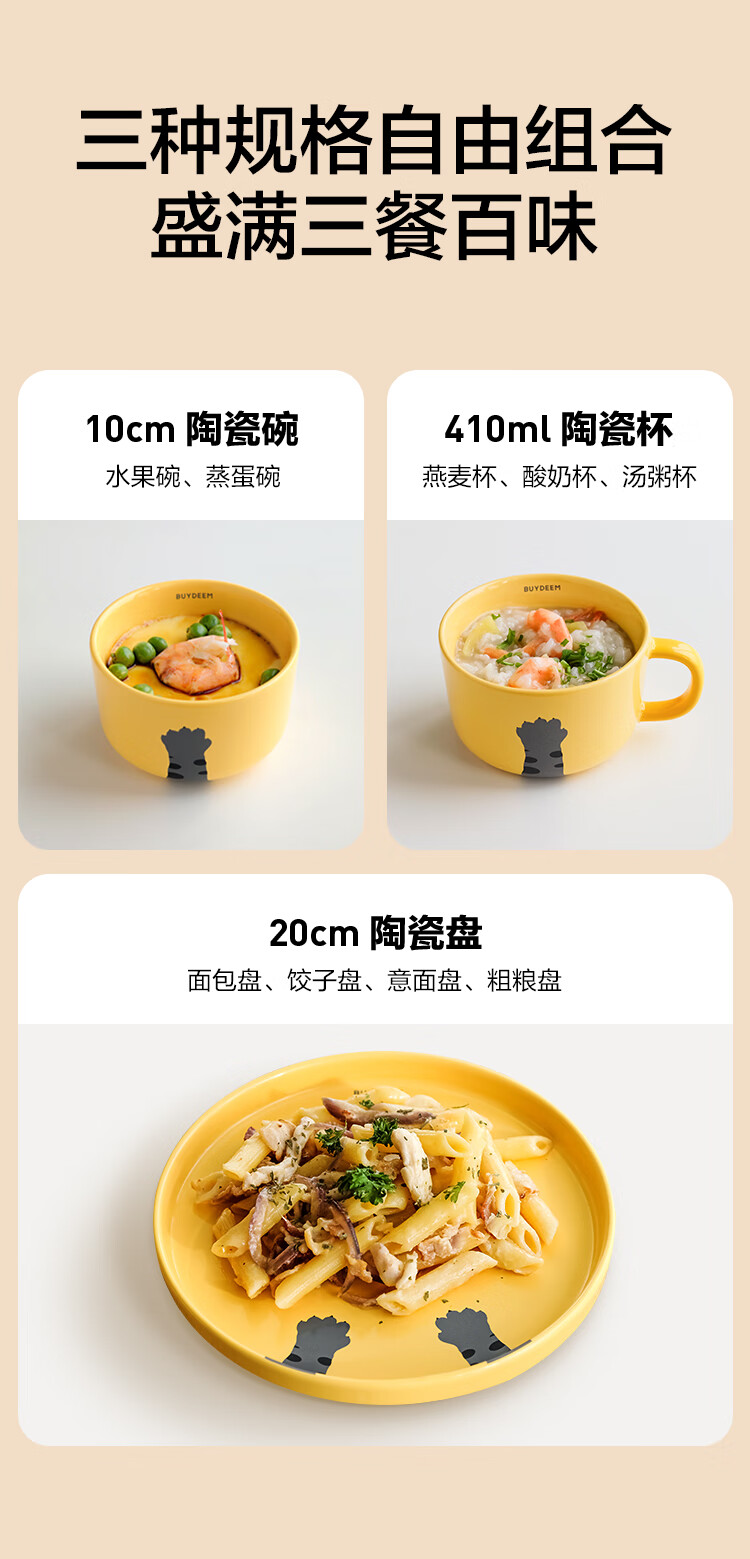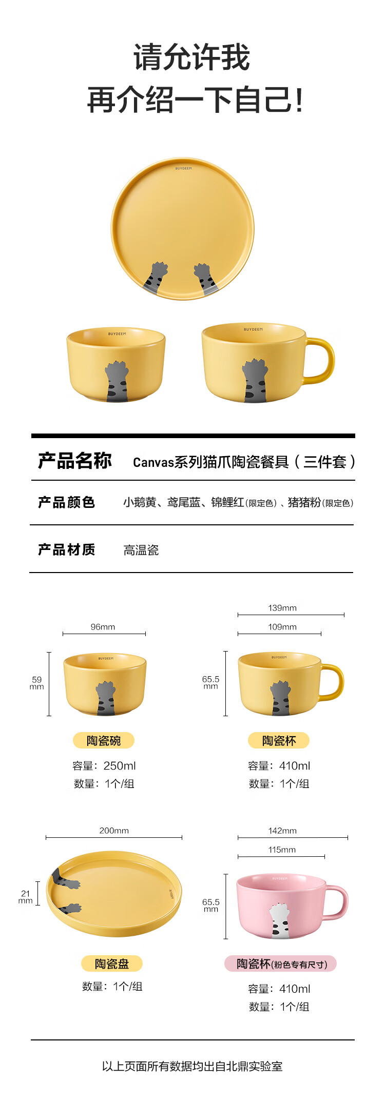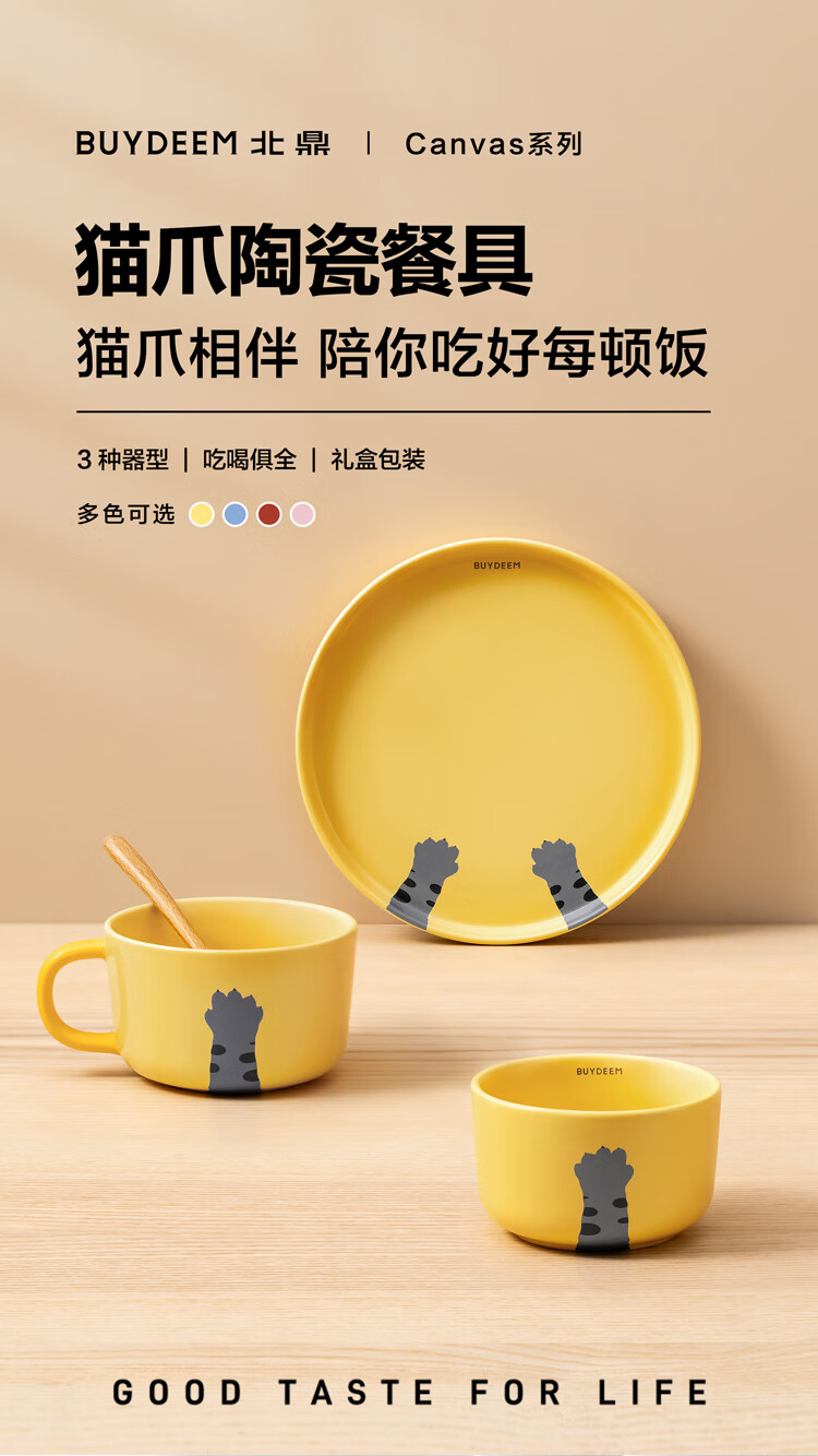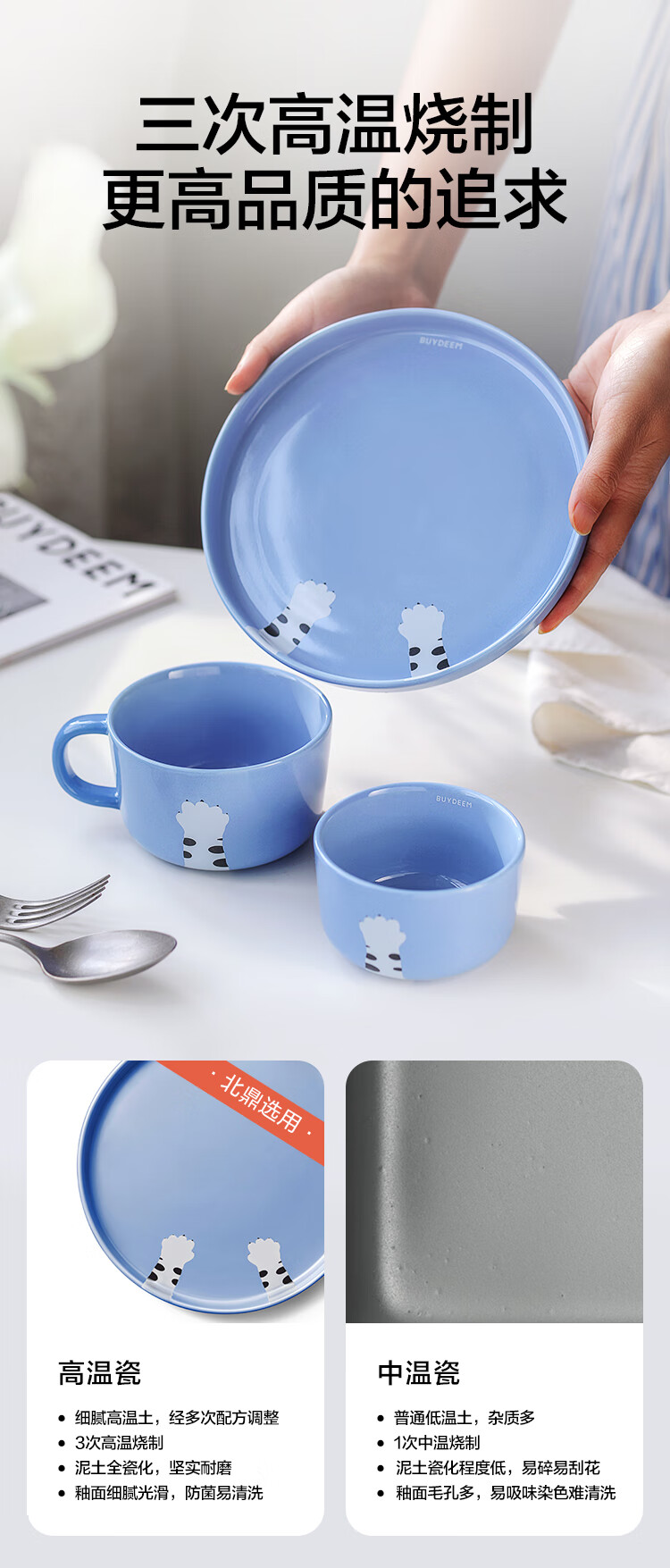 商品名称:(巨邦佑)R+北鼎猫爪餐具套装(3头)陶瓷碗盘马克杯整套早餐送礼 (下单前备注颜色或联系客服)