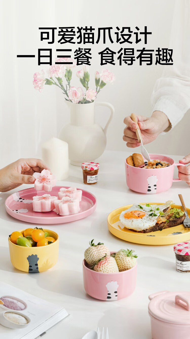 (巨邦佑)R+北鼎猫爪餐具套装(3头)陶瓷碗盘马克杯整套早餐送礼 (下单前备注颜色或联系客服)
