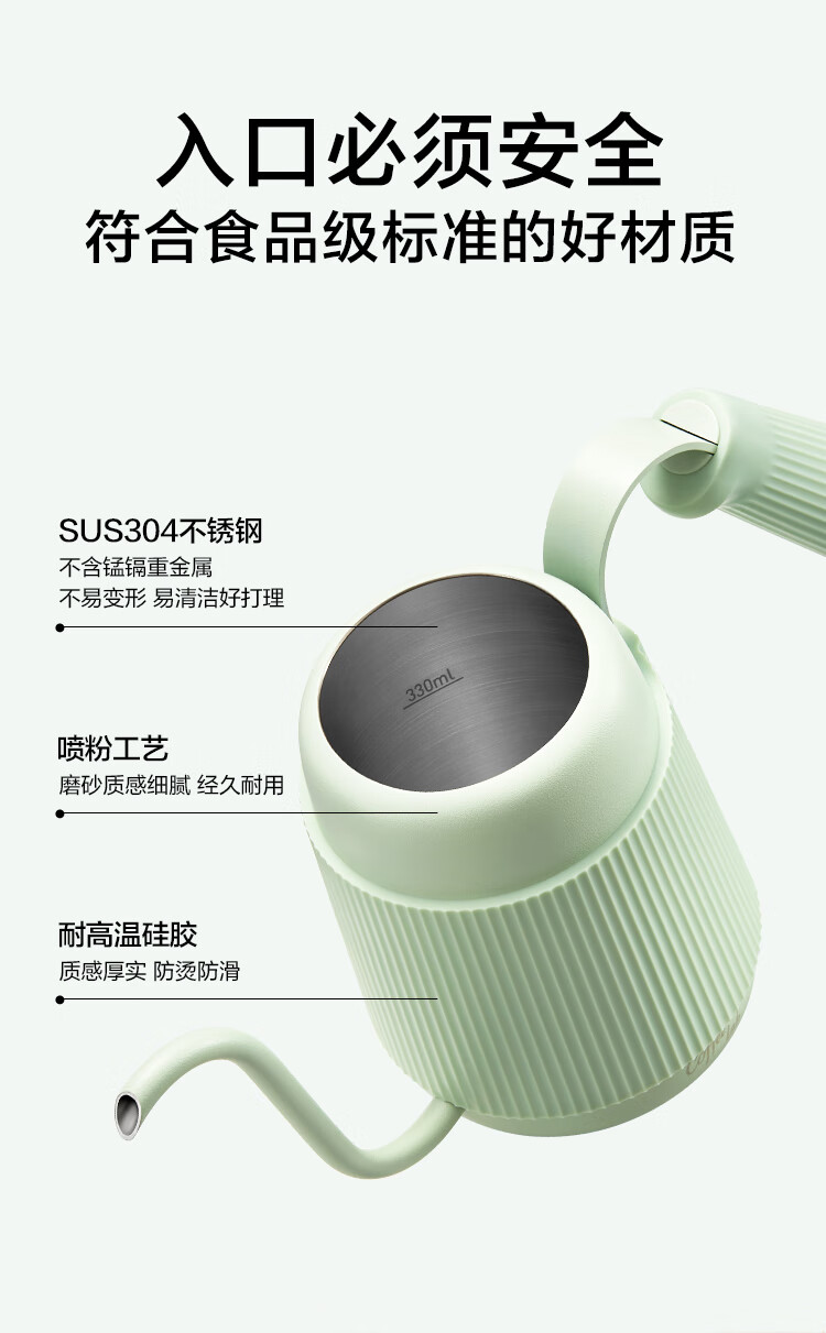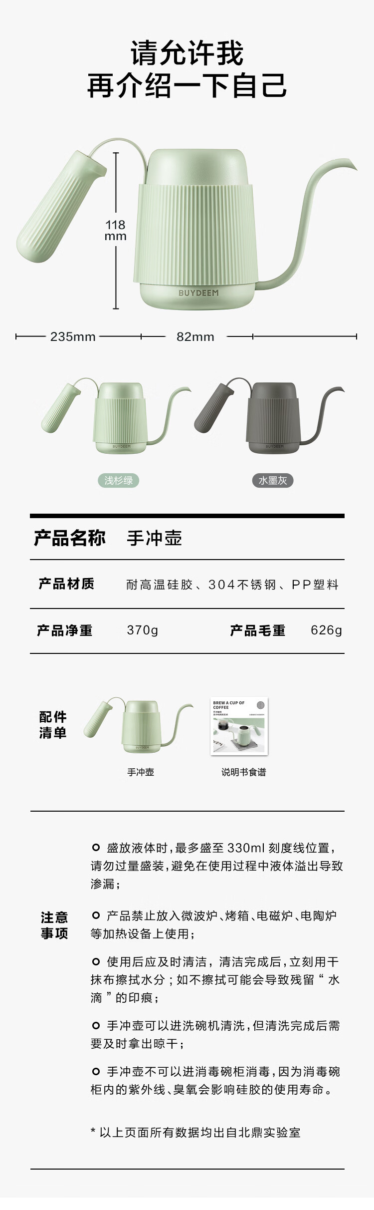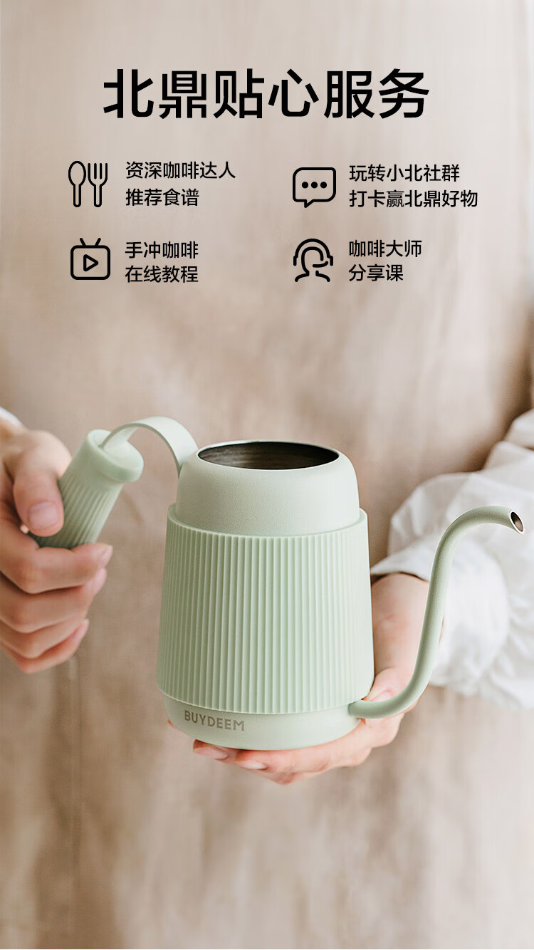 商品名称:(巨邦佑)R+北鼎(Buydeem) 咖啡手冲壶330ml长嘴壶家用挂耳细口壶 便携 流线壶嘴 (下单前备注颜色或联系客服)