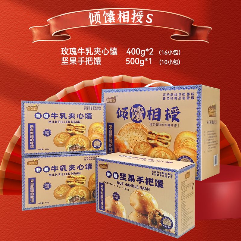 (世星阳光) 御疆途 新疆倾囊相授礼盒S 1300g盒 (玫瑰牛乳夹心囊400g*2 坚果手把囊500g*1) 新疆牛奶软软馕饼玫瑰夹心馕坚果手把馕坚果大列巴送人礼盒装 代餐饱腹无添加面包源头直发