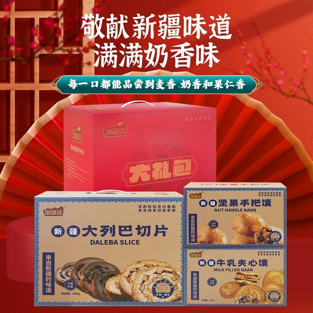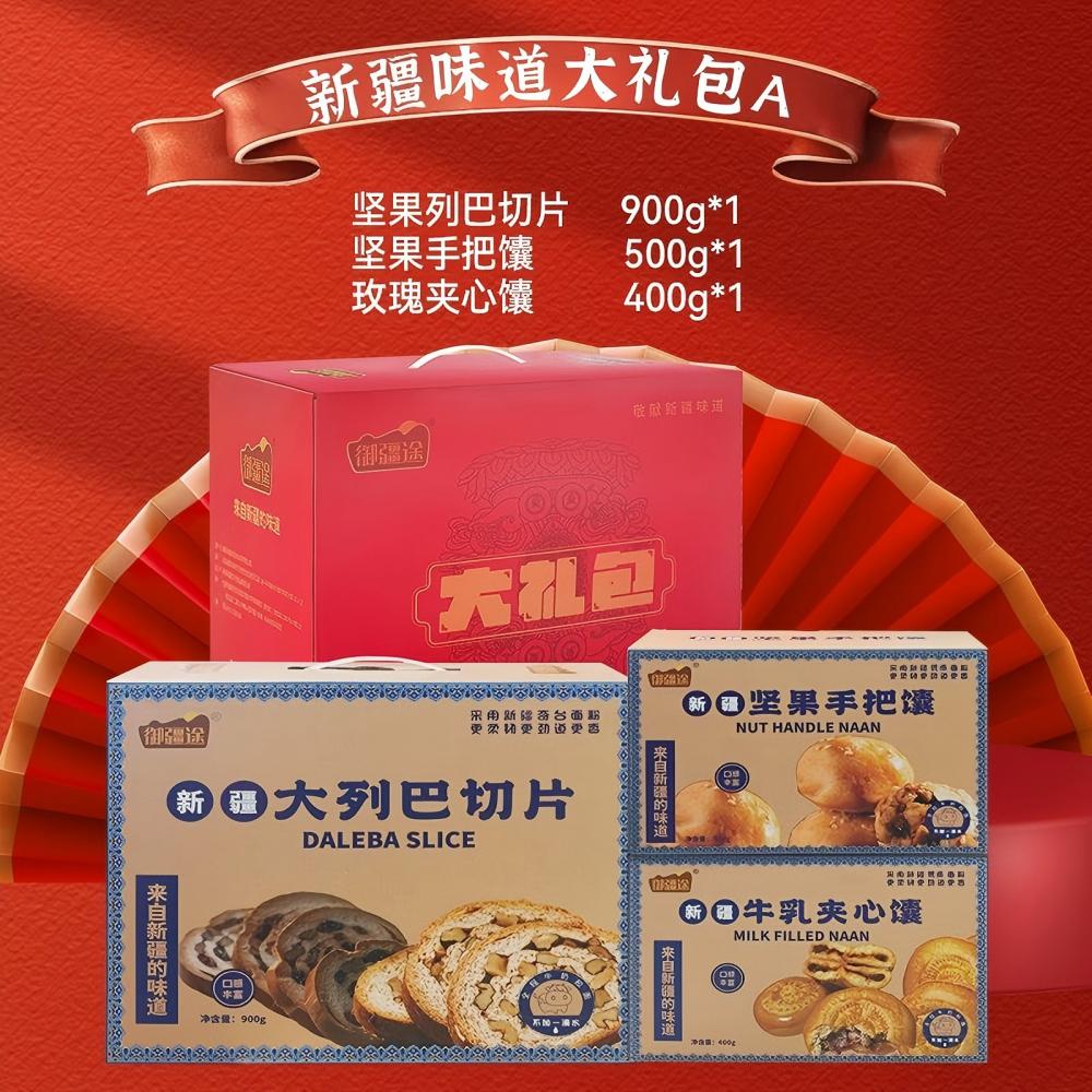 (世星阳光) 御疆途 新疆味道大礼包A 1800克盒 (新疆大列巴切片坚果味900g*1+玫瑰夹心馕400g*1+坚果手把馕500g*1) 新疆牛奶软软馕饼玫瑰夹心馕坚果手把馕坚果大列巴送人礼盒装 代餐饱腹无添加面包源头直发