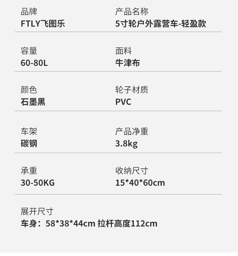 商品名称:(巨邦佑)BH+飞图乐(FTLY)5寸万向轮露营车-轻盈款LYC00 户外露营车小推车轻便耐用