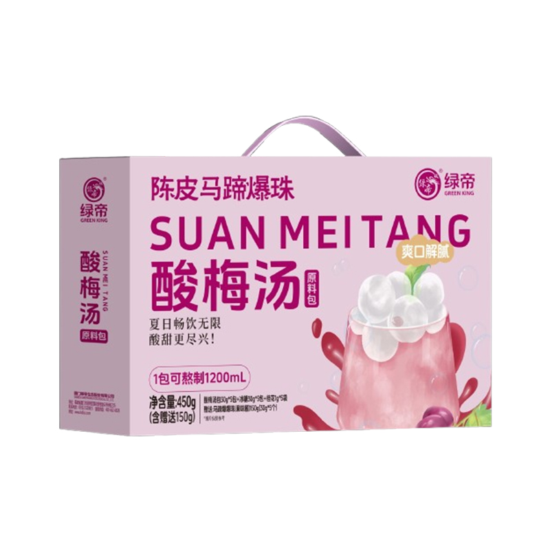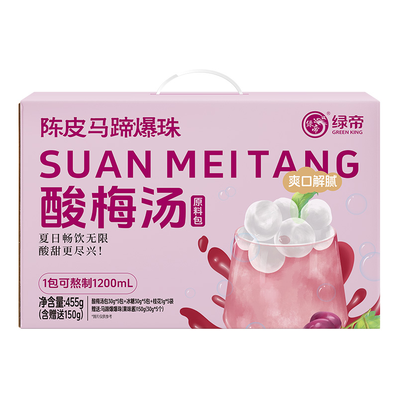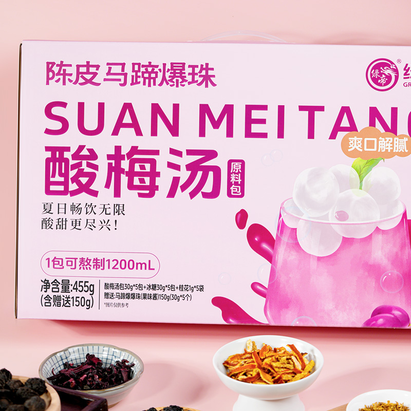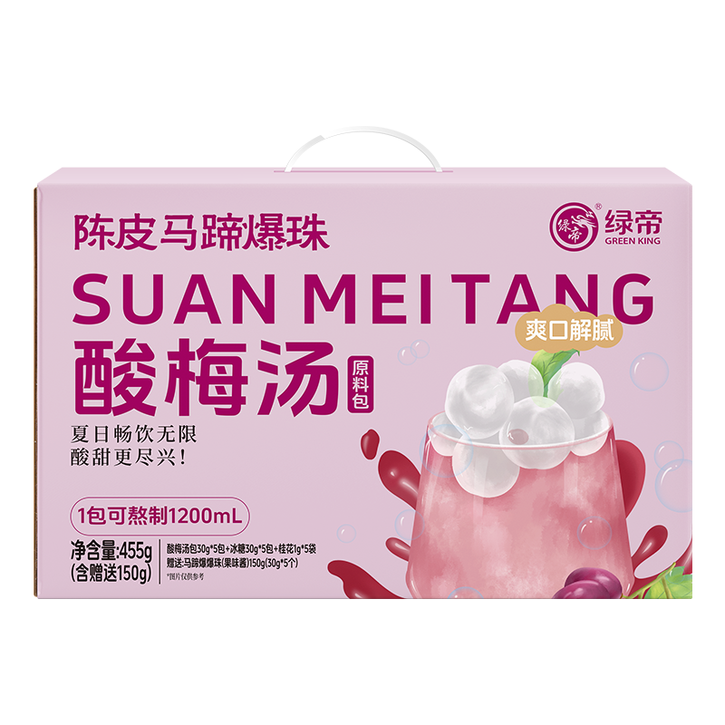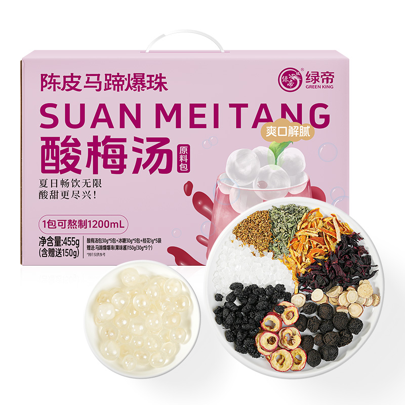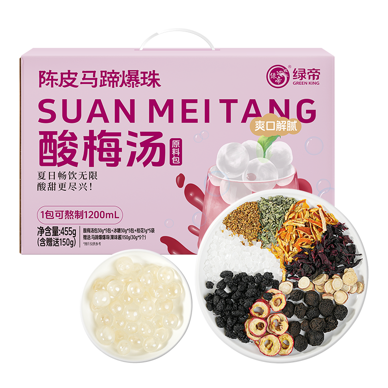 商品名称:(巨邦佑)T+绿帝陈皮马蹄爆珠酸梅汤原料包礼盒455g(酸梅汤原料包61g、马蹄爆爆珠(果味酱)150g)