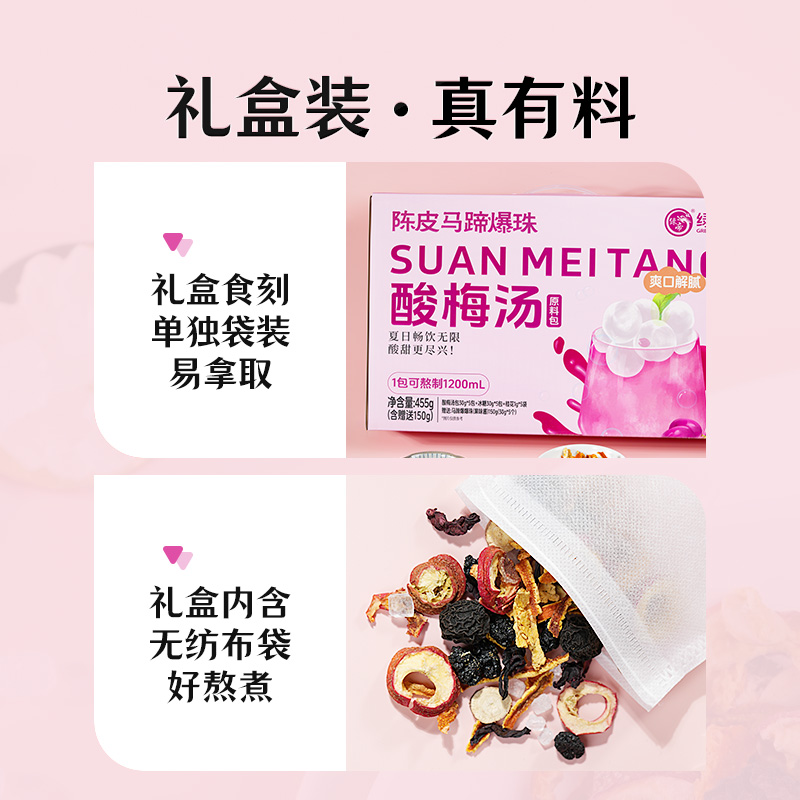 (巨邦佑)T+绿帝陈皮马蹄爆珠酸梅汤原料包礼盒455g(酸梅汤原料包61g、马蹄爆爆珠(果味酱)150g)
