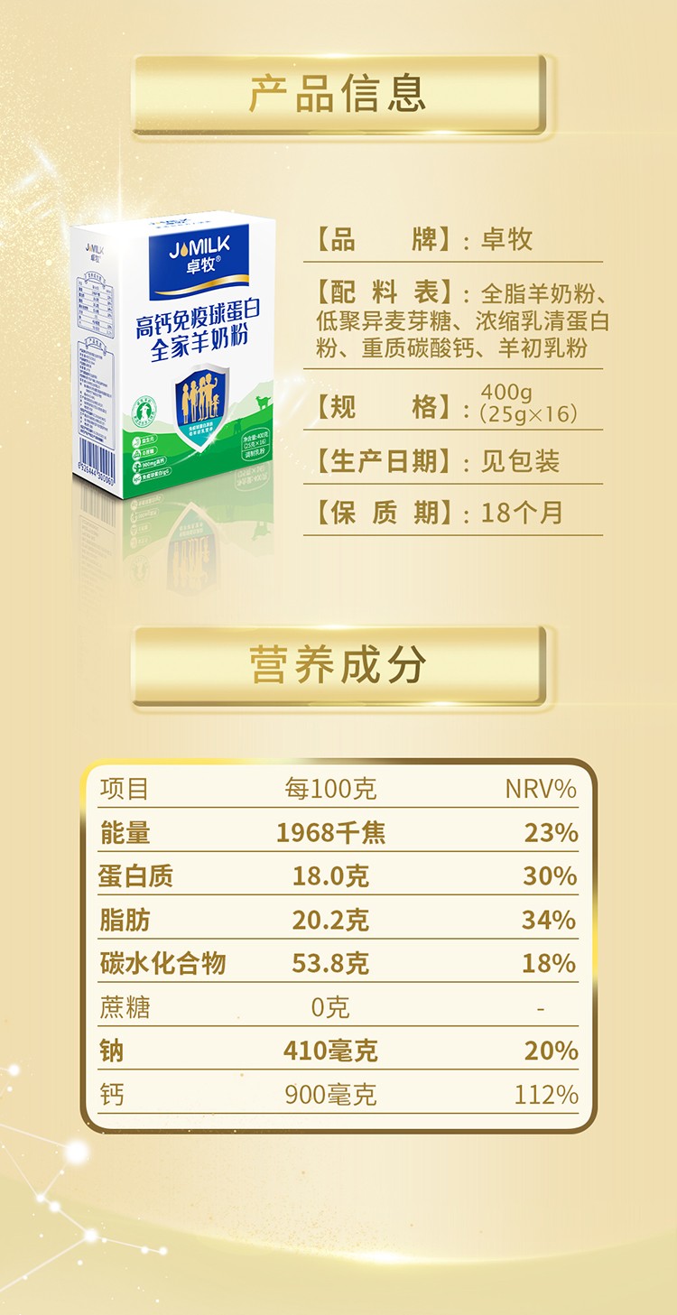 商品名称:(世星阳光)卓牧免疫球蛋白羊奶粉400g盒 全家羊奶添加羊初乳3岁以上适合
