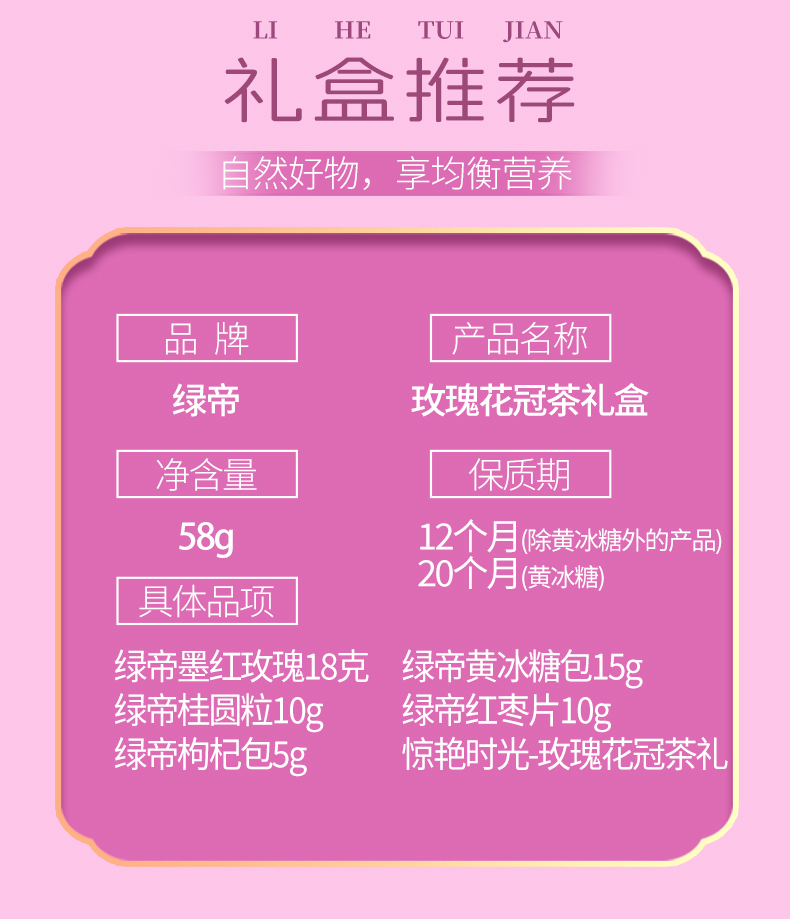 商品名称:(世星阳光)绿帝惊艳时光-玫瑰花冠茶礼盒58g 自然好物 均衡营养