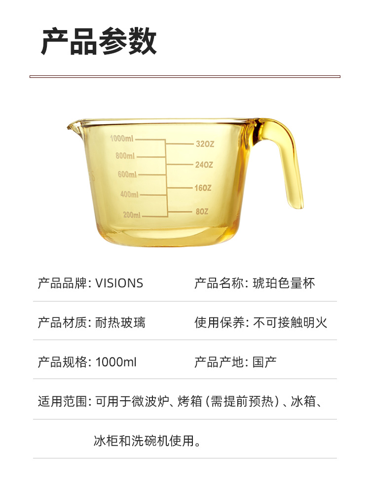 商品名称:(世星阳光)康宁 VISIONS1L琥珀色量杯(黄盒装)VS-MCP1LCNBOMKZ 耐热耐冷 冰箱烤箱微波均可使用