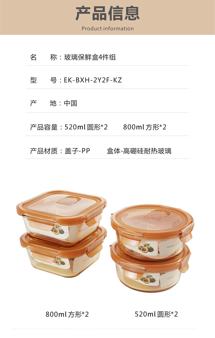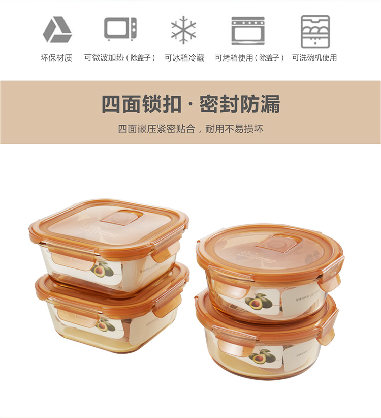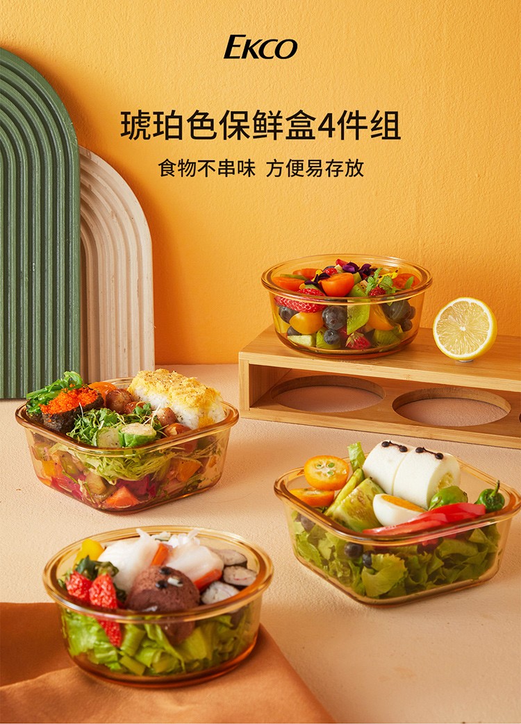 商品名称:(世星阳光)康宁 EKCO琥珀色玻璃保鲜盒4件套 EK-BXH-2Y2F-KZ 四面扣锁 密封防漏