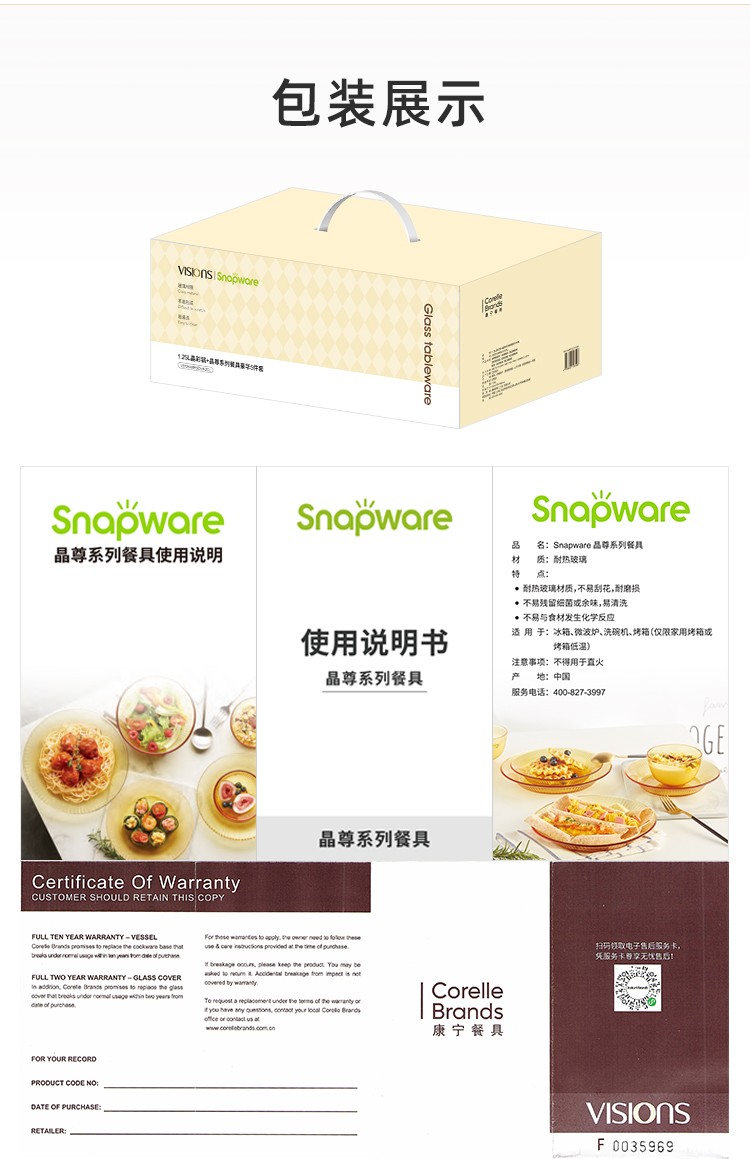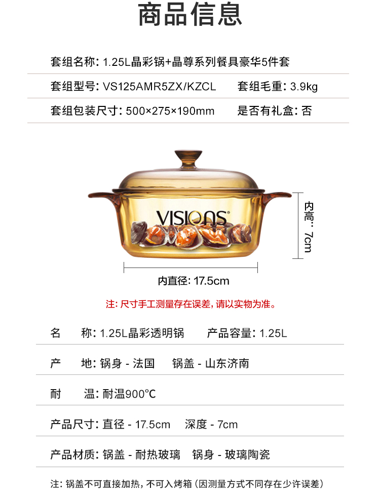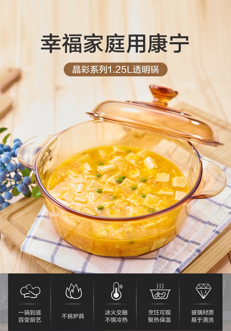 商品名称:(世星阳光)康宁 VISIONSVISIONS 晶彩锅1.25L+SN晶尊系列餐具豪华5件套(2小碗1大碗1小盘1大盘)-成品彩盒 VS125AMR5ZXKZCL 锅碗套装 持久耐磨不易刮花 厚碗底耐冷耐热
