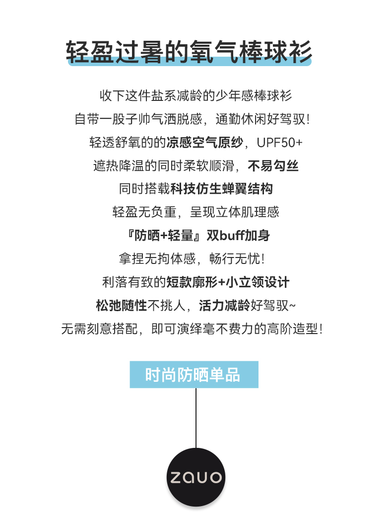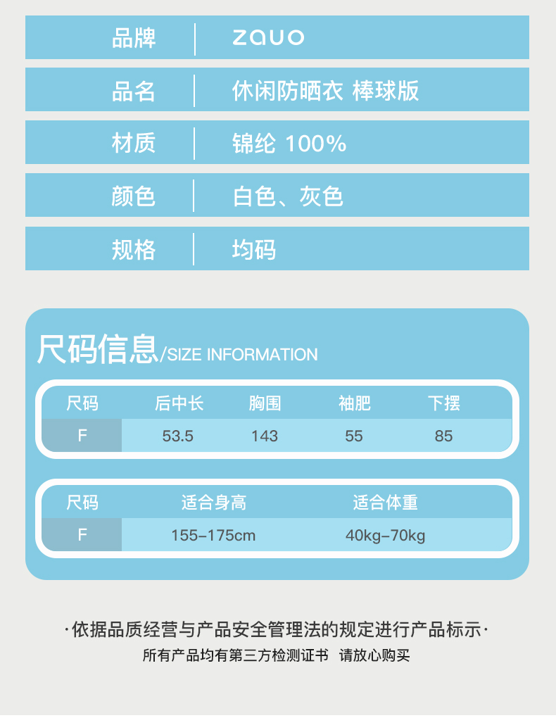 商品名称:(汇景缘)(F)zauo防晒棒球服 灰色新款轻薄透气休闲上衣防紫外线百搭显瘦防晒衣