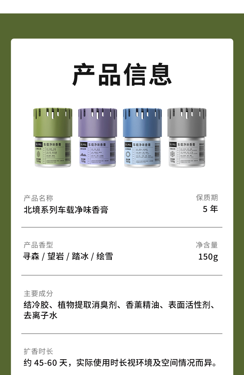 商品名称:(巨邦佑)BJ+扶云集北境系列车载净味香膏 150g 车载香薰固体香膏汽车香水高级淡香持久车用香氛祛味摆件