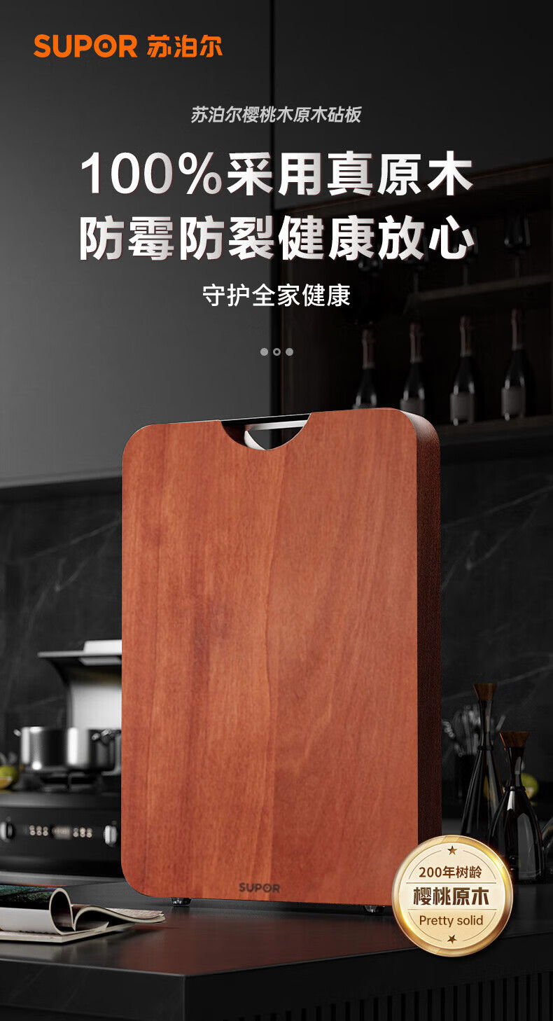 (巨邦佑)BJ+苏泊尔 樱桃木砧板 40*28*2.5cm实木防霉面板家用加厚切菜板