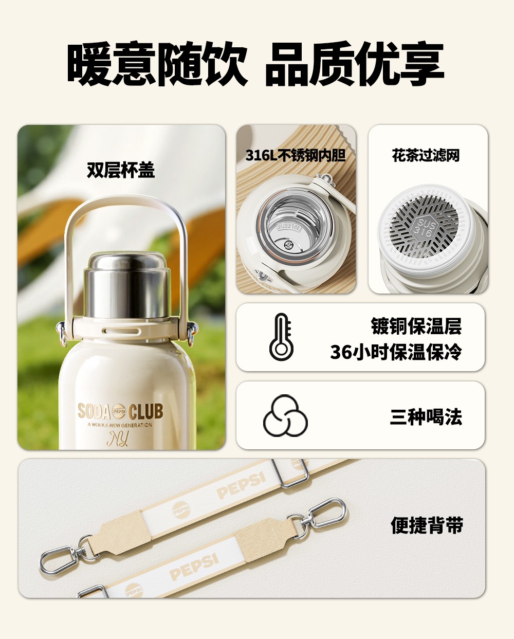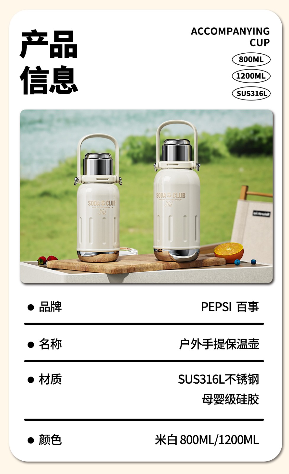 商品名称:(世星阳光)百事(PEPSI)可乐保温壶 1200ML/800ML BS-H-800-002 316不锈钢保温杯大容量旅行壶运动手提壶