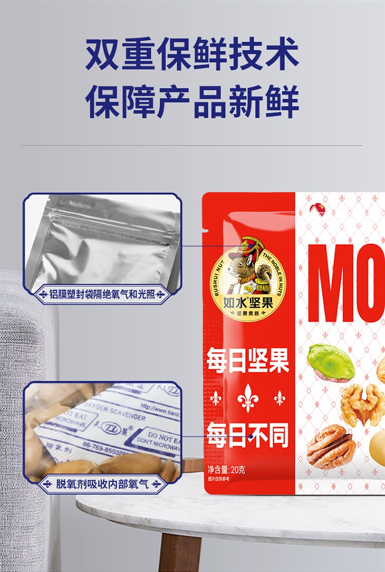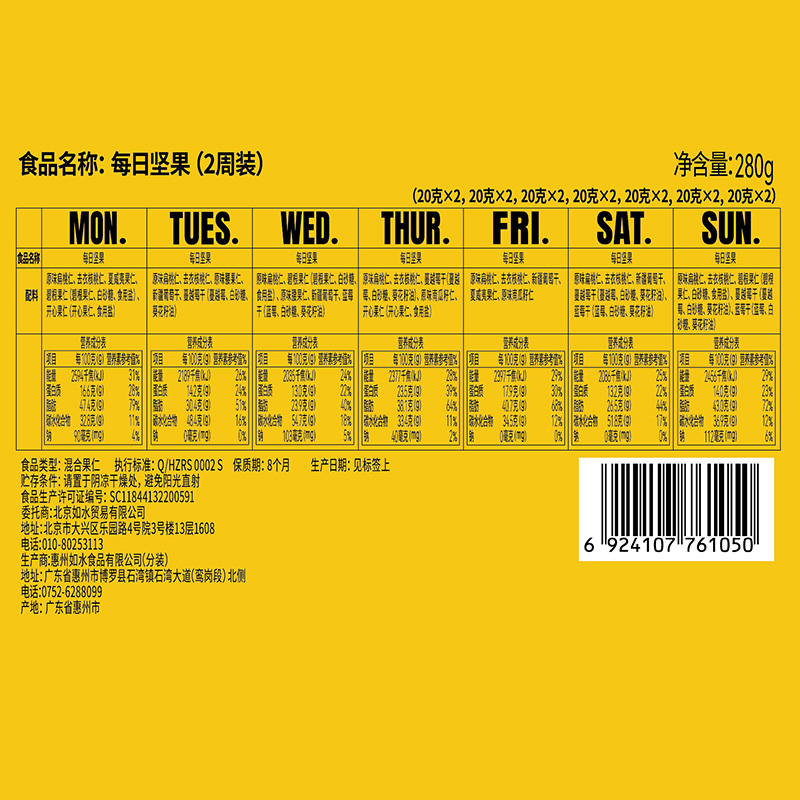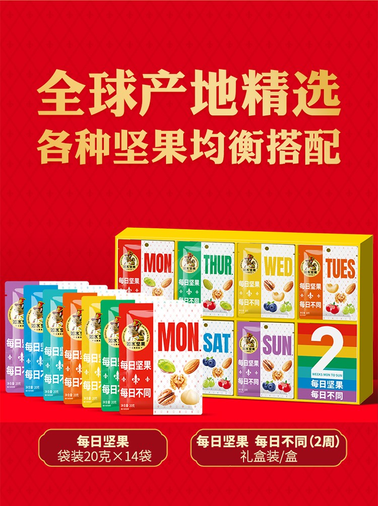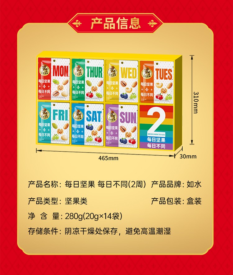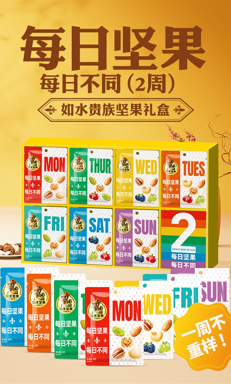 商品名称:(超运·禾贸)如水每日坚果每日不同(2周装)280g 健康休闲食品零食下午茶点 每日坚果每日不同