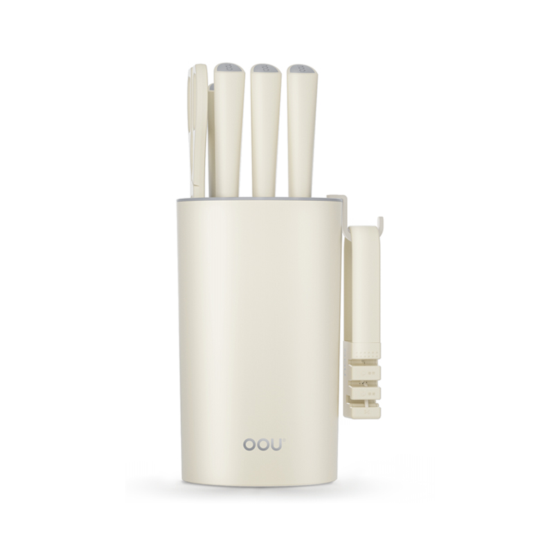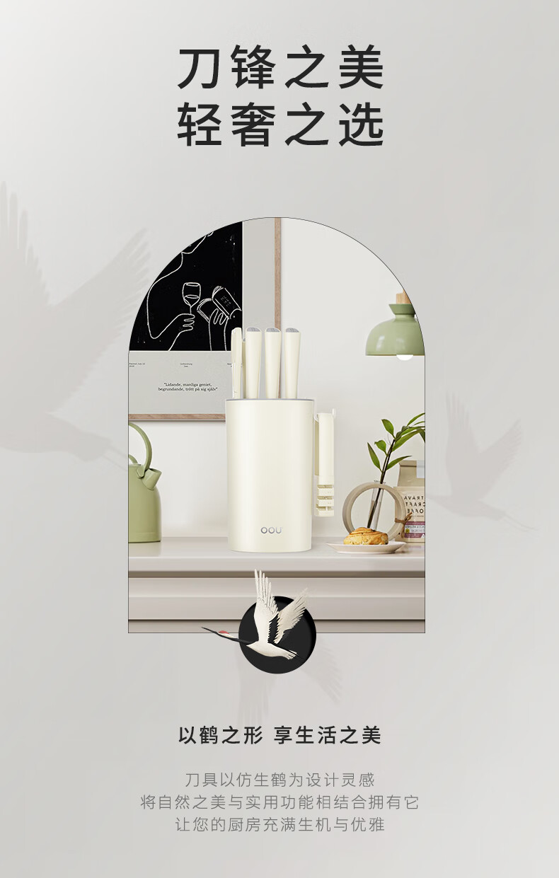(超运·禾贸)OOU DJ0069 鹤系列七件套 白色 优质钢材家用菜刀切肉刀剪刀带磨刀器抗氧防锈