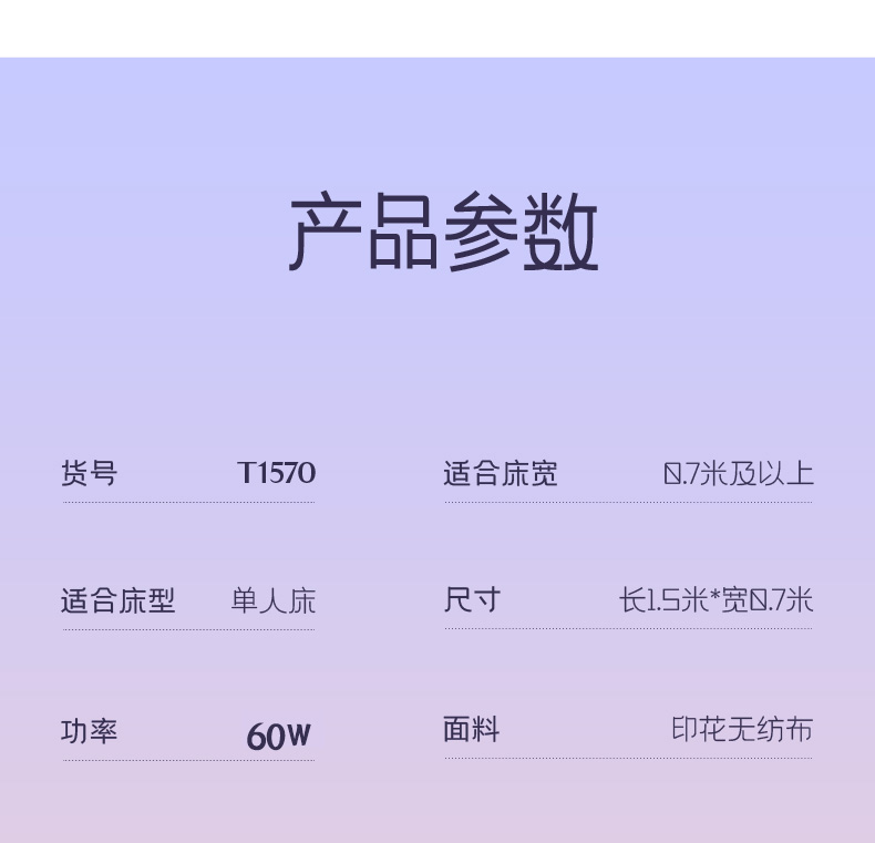 商品名称:(世星阳光)+彩虹 彩虹全线路安全调温电热毯(单人)印花 T1570 1.5mx0.7m 高温断电保护 舒适亲肤