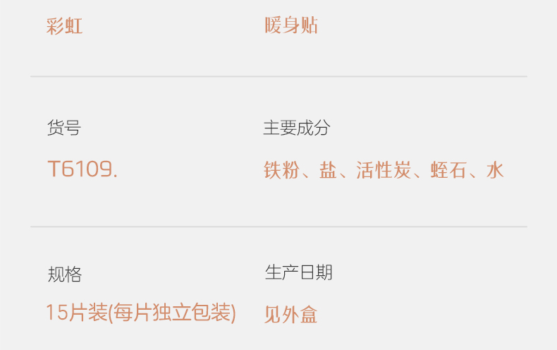商品名称:(世星阳光)+彩虹 彩虹暖身贴轻薄款 15片装 T6109 小巧服帖 亲肤透气 严选原料 轻薄易携