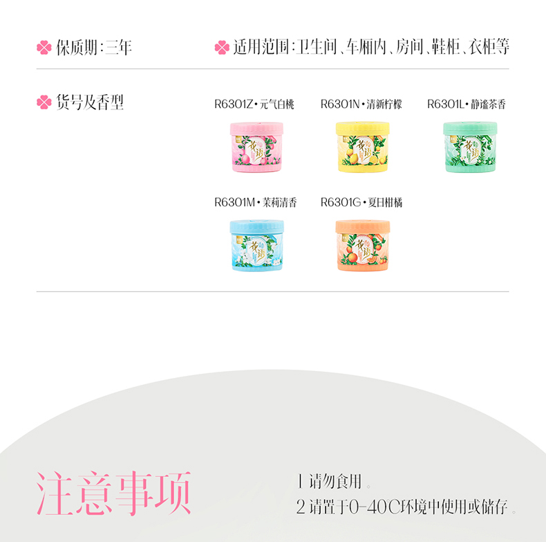 商品名称:(世星阳光)+彩虹卫士 固体清香剂 78g*5盒 元气白桃 清新柠檬 茉莉清香 静谧茶香 夏日柑橘 持久留香 浓度可调