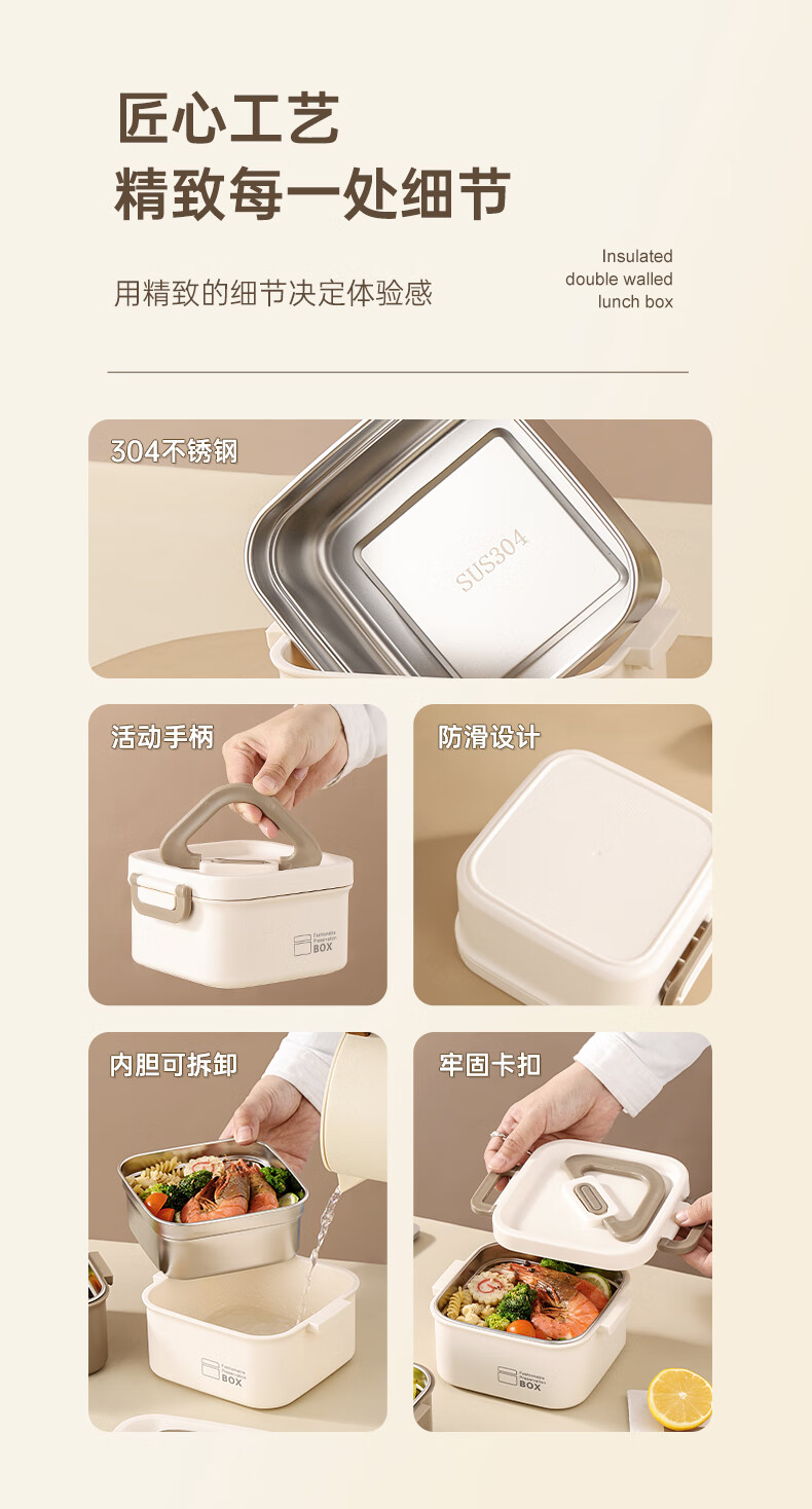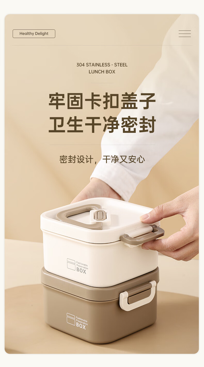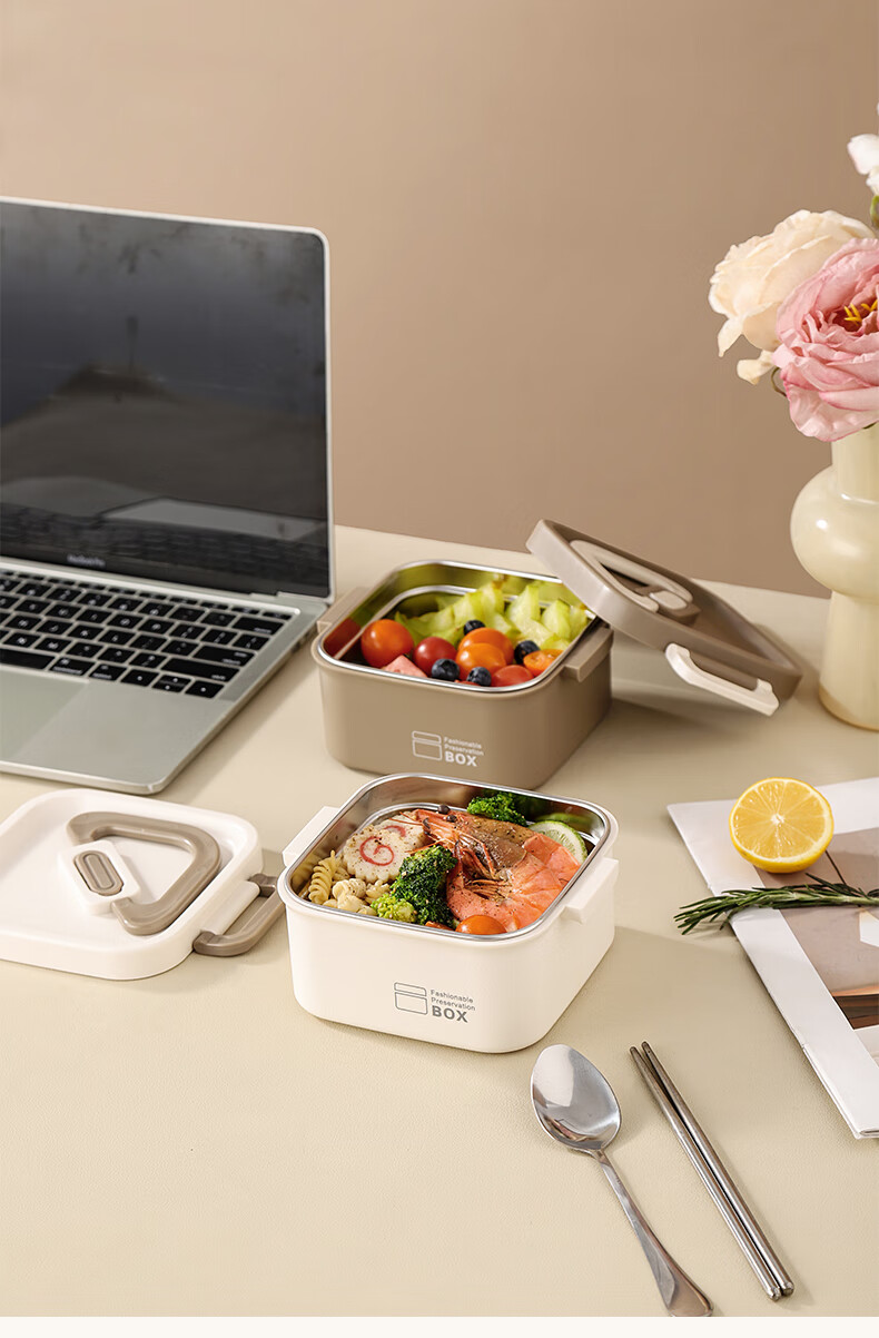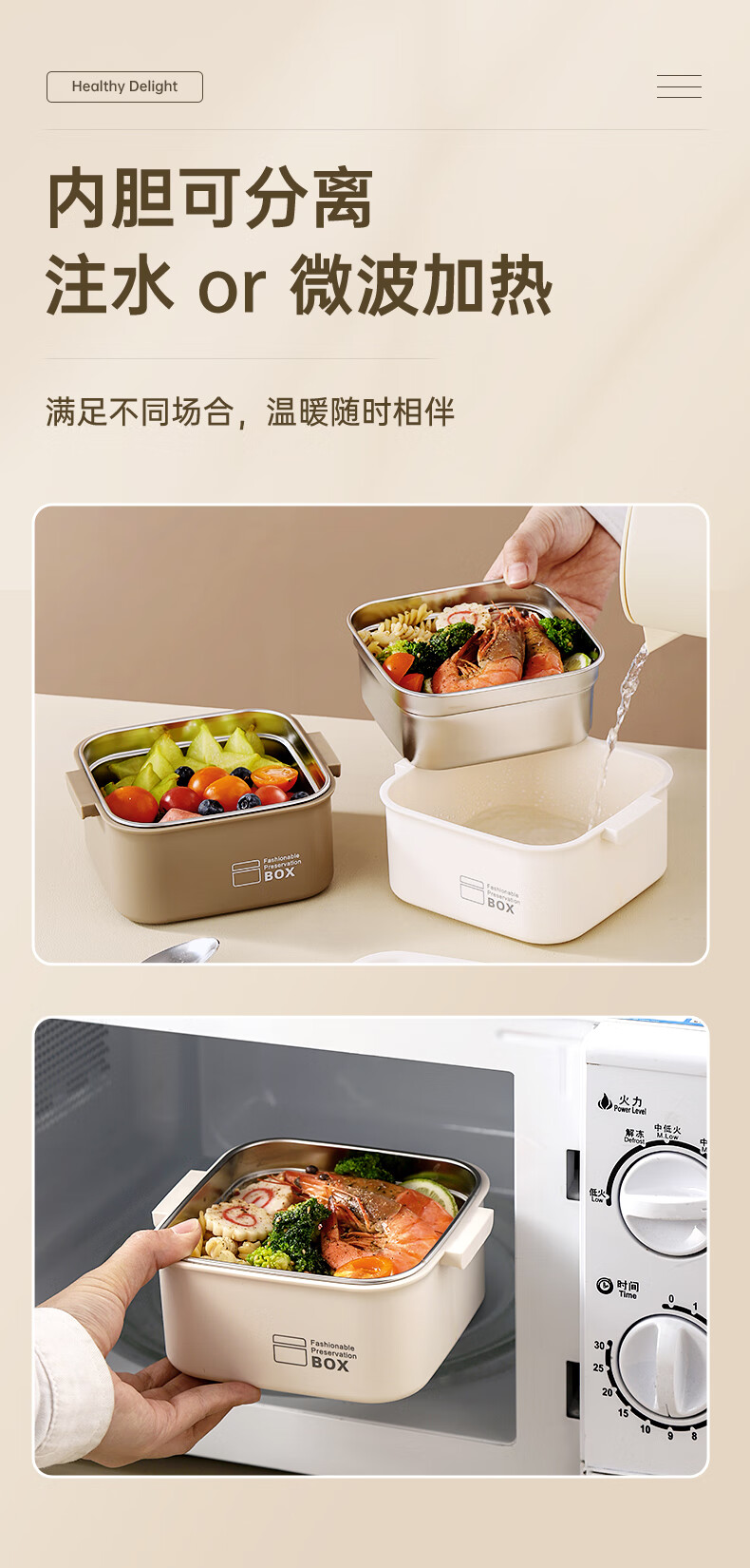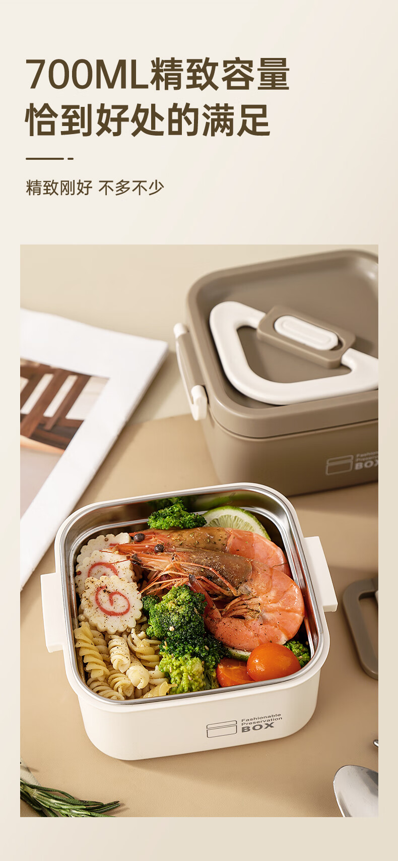 (巨邦佑)BJ+物芯质造304不锈钢保鲜饭盒700ml 米色咖色 可拆卸内胆密封保鲜容易清洗隔热防烫