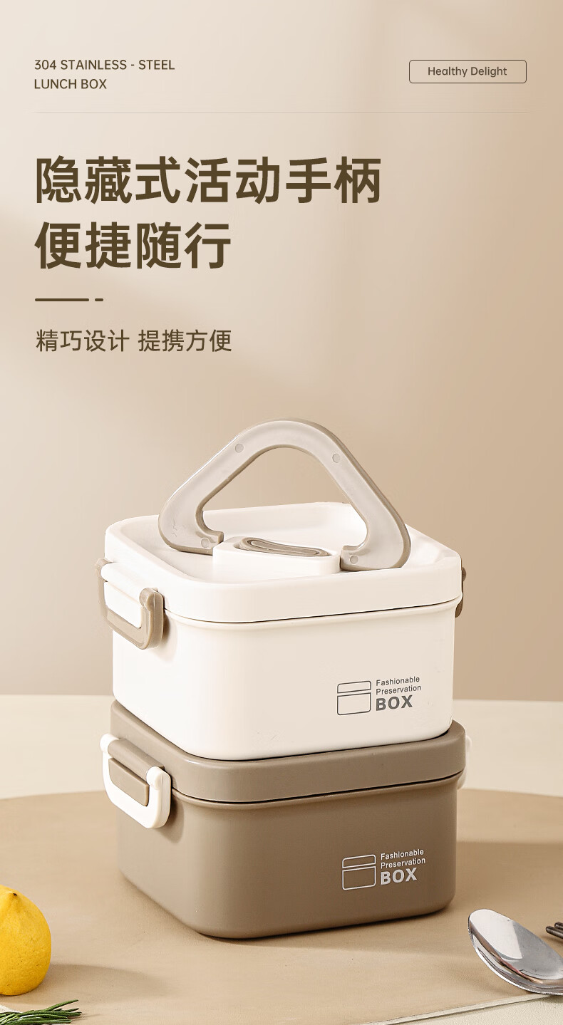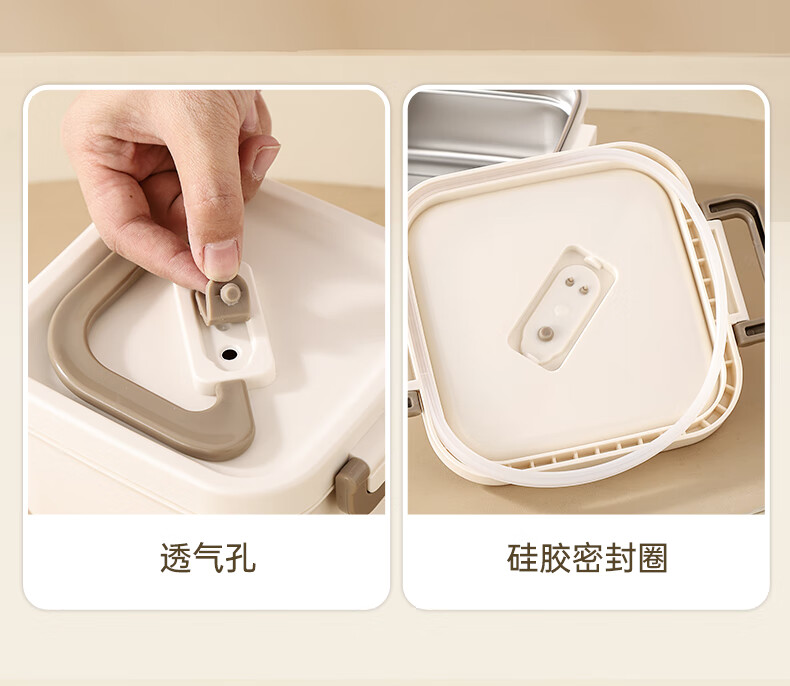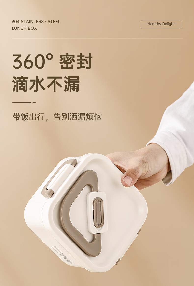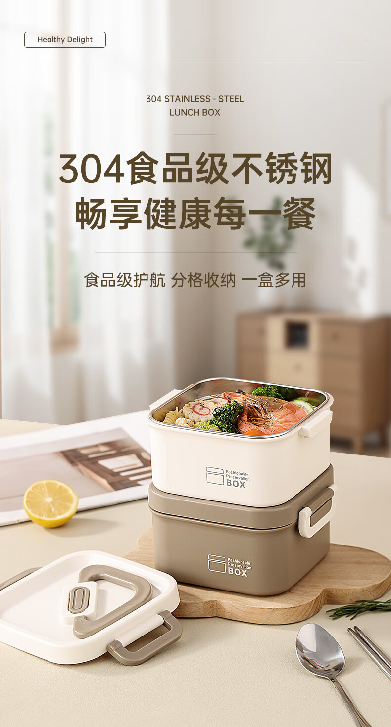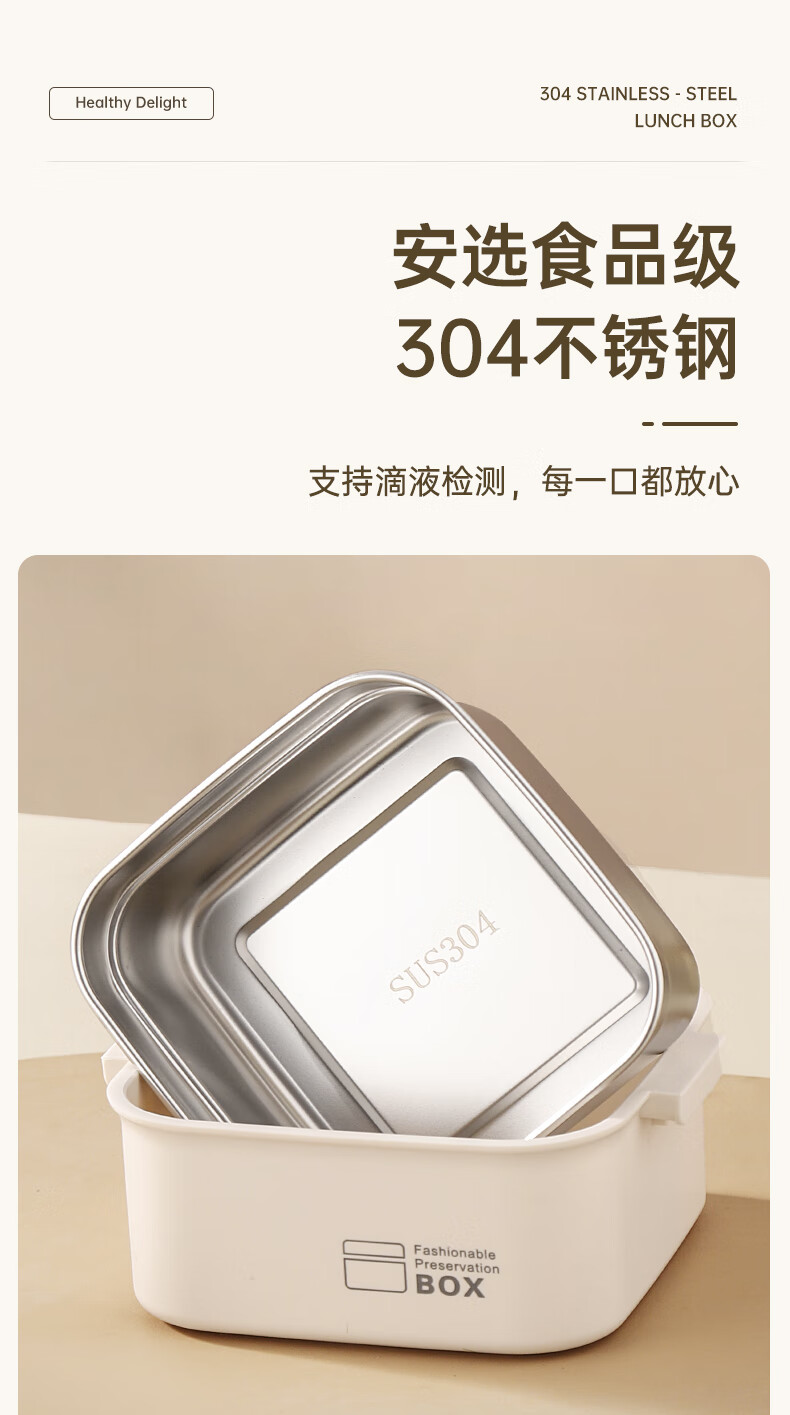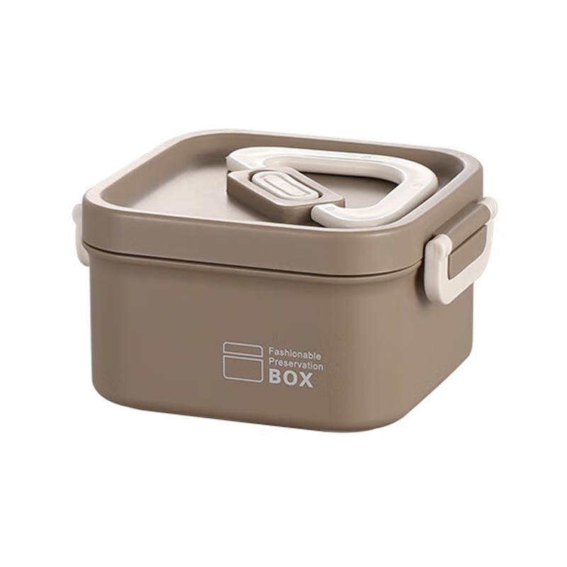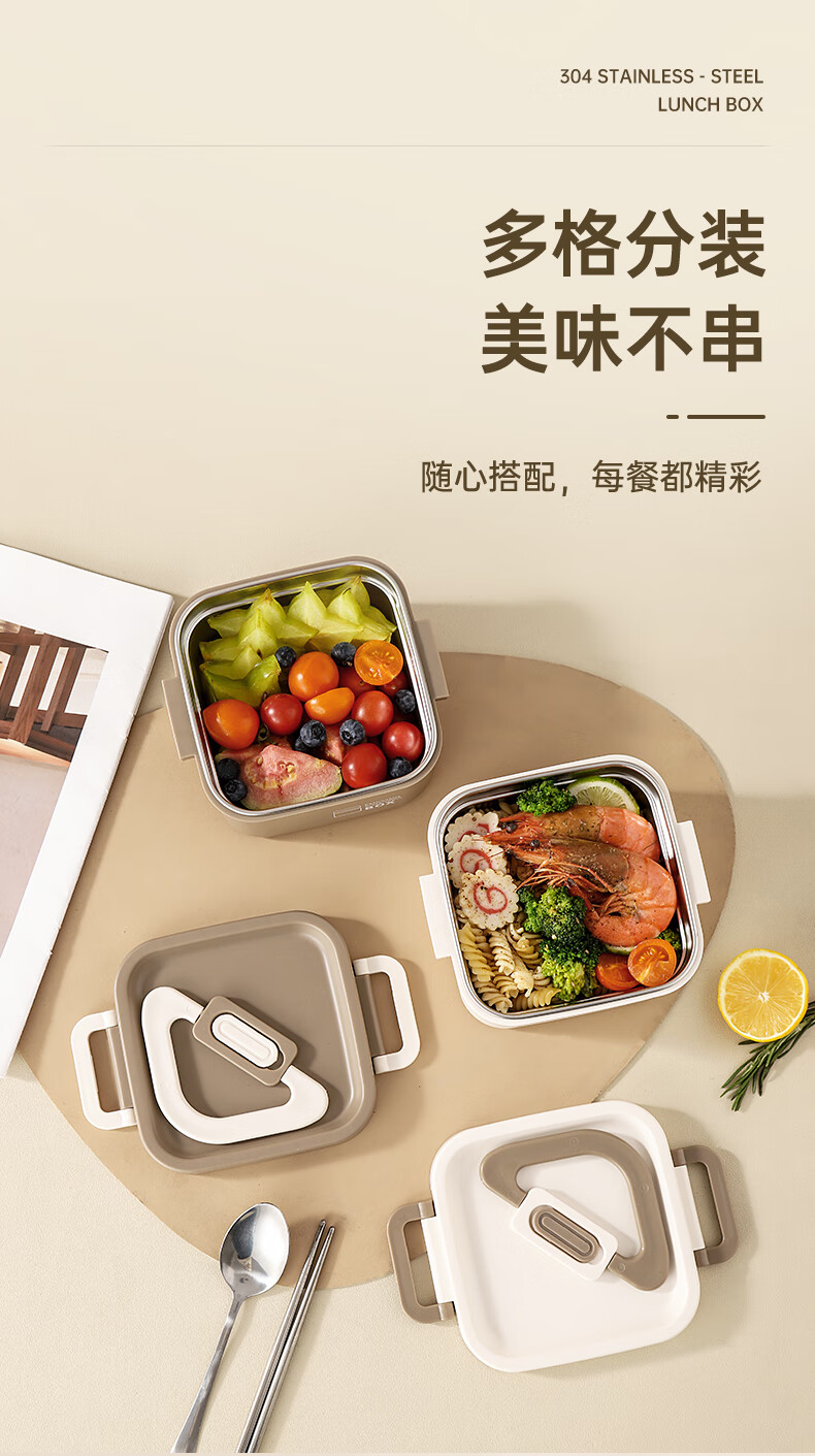 (巨邦佑)BJ+物芯质造304不锈钢保鲜饭盒700ml 米色咖色 可拆卸内胆密封保鲜容易清洗隔热防烫