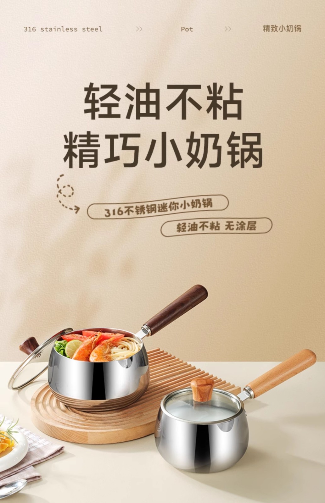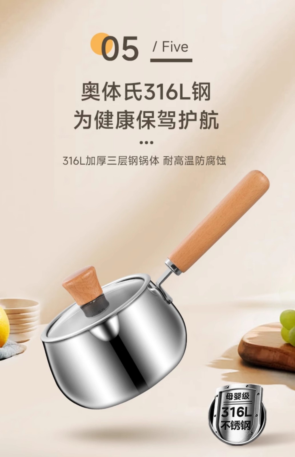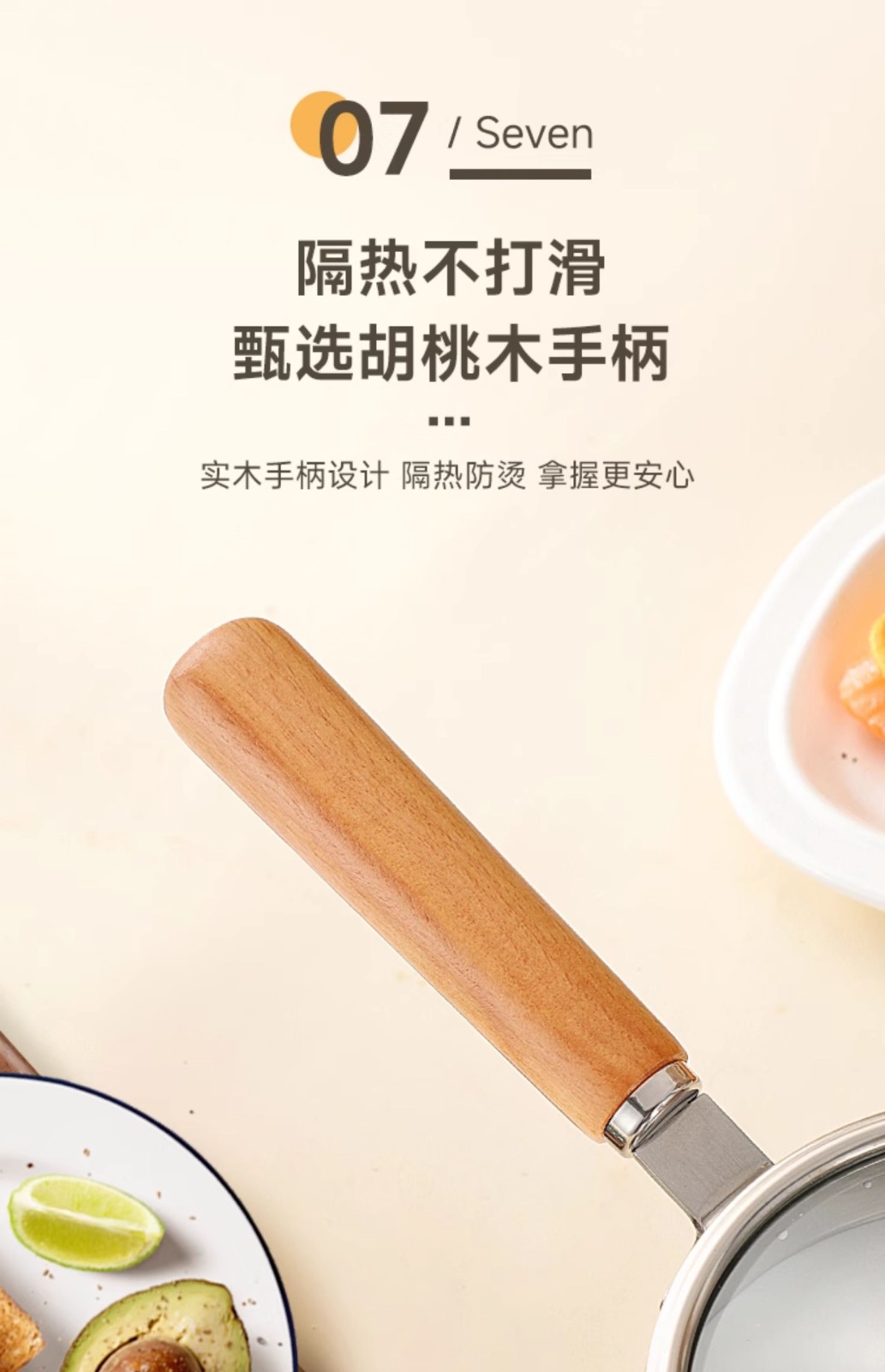 (巨邦佑)BJ+物芯质造Smart316不锈钢小奶锅 榉木柄胡桃木炳辅食锅汤锅泡面蒸锅燃气电磁炉
