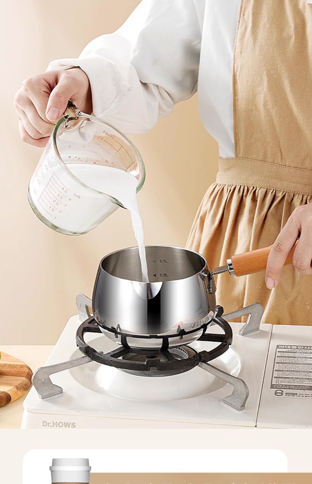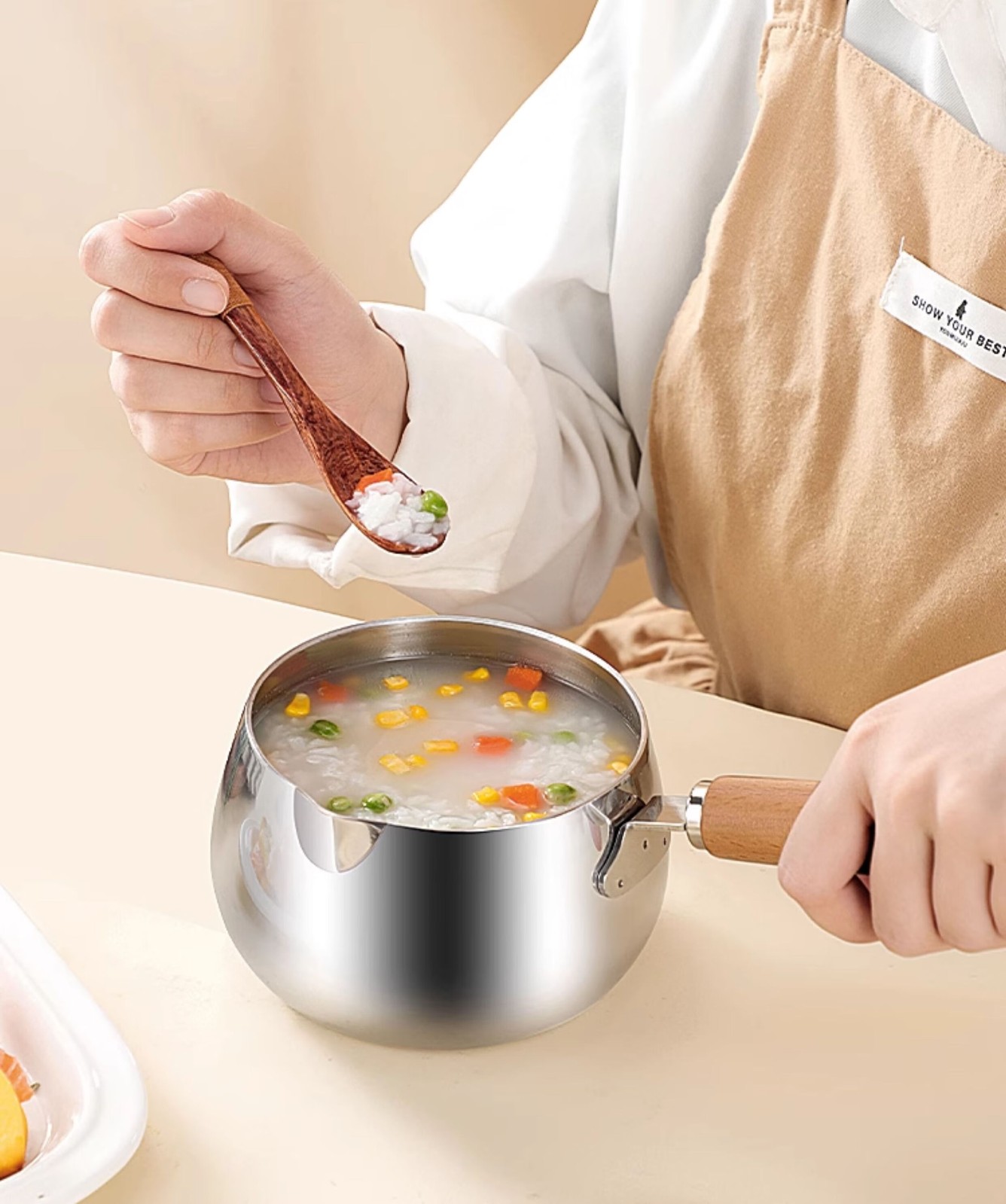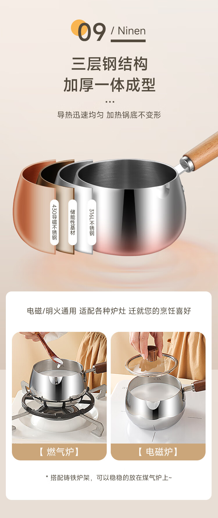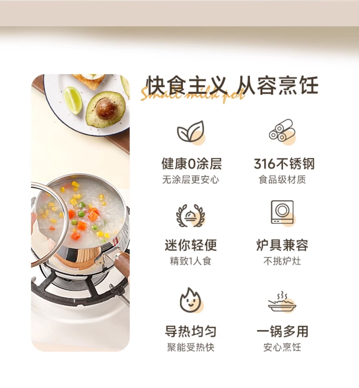 (巨邦佑)BJ+物芯质造Smart316不锈钢小奶锅 榉木柄胡桃木炳辅食锅汤锅泡面蒸锅燃气电磁炉
