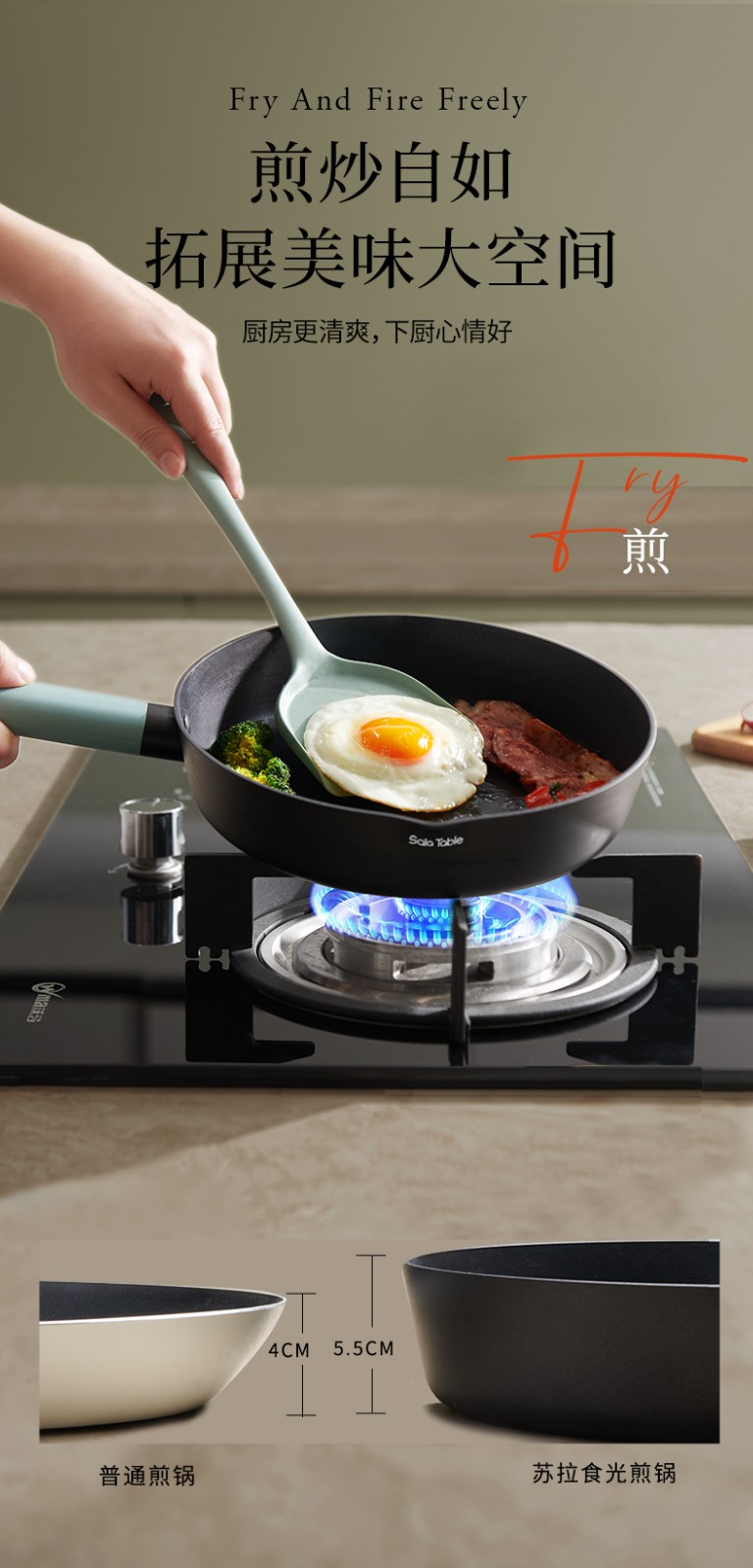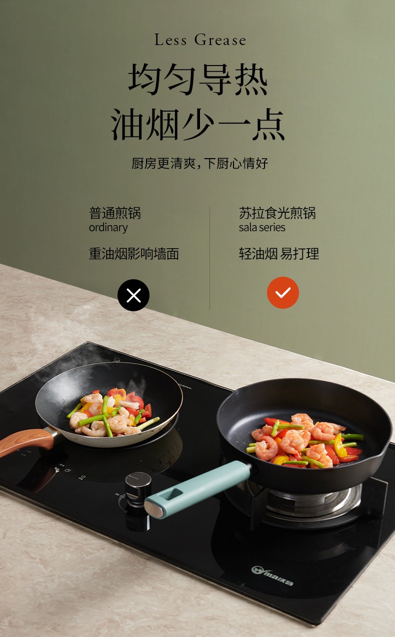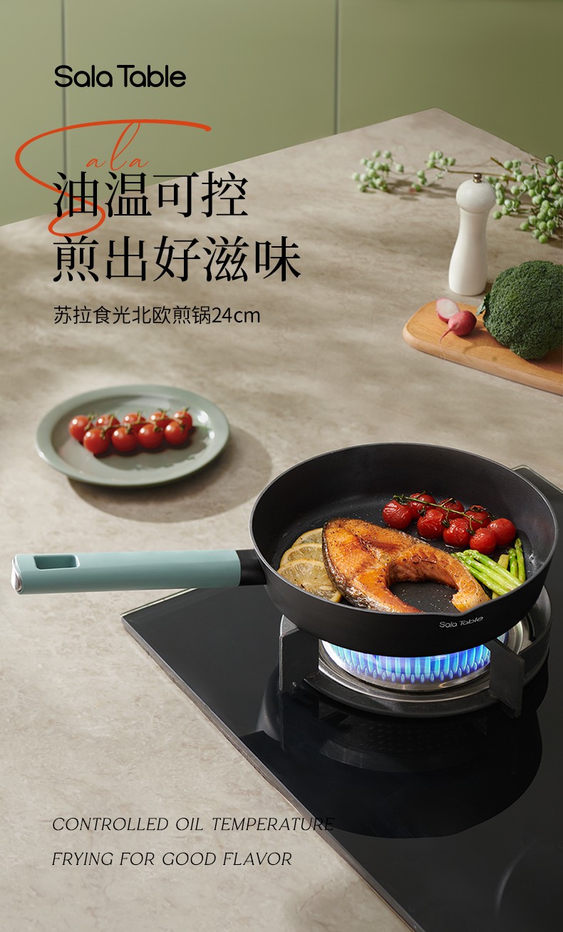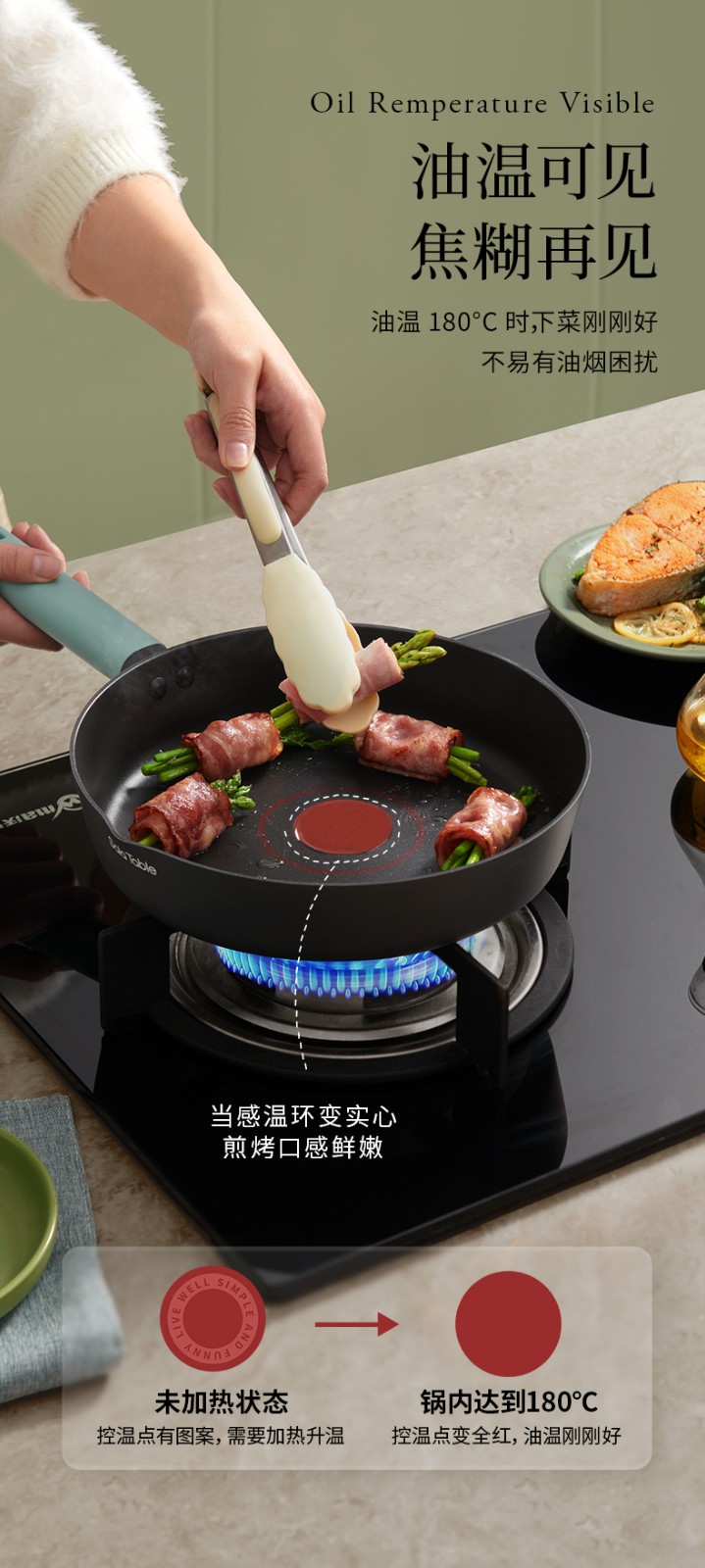 (世星阳光)+WY苏拉食光 北欧钛晶煎锅 24cm SL-JL24G1 控温点有图案 需要加热升温 控温点变全红 油温刚刚好