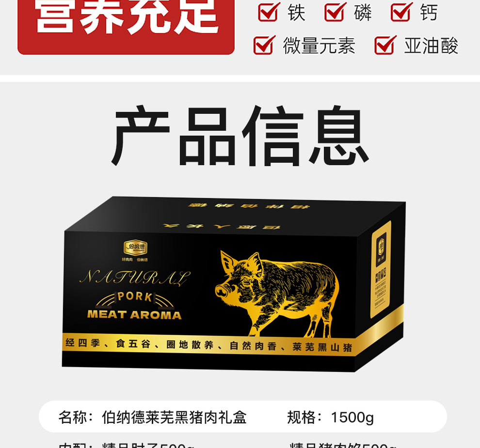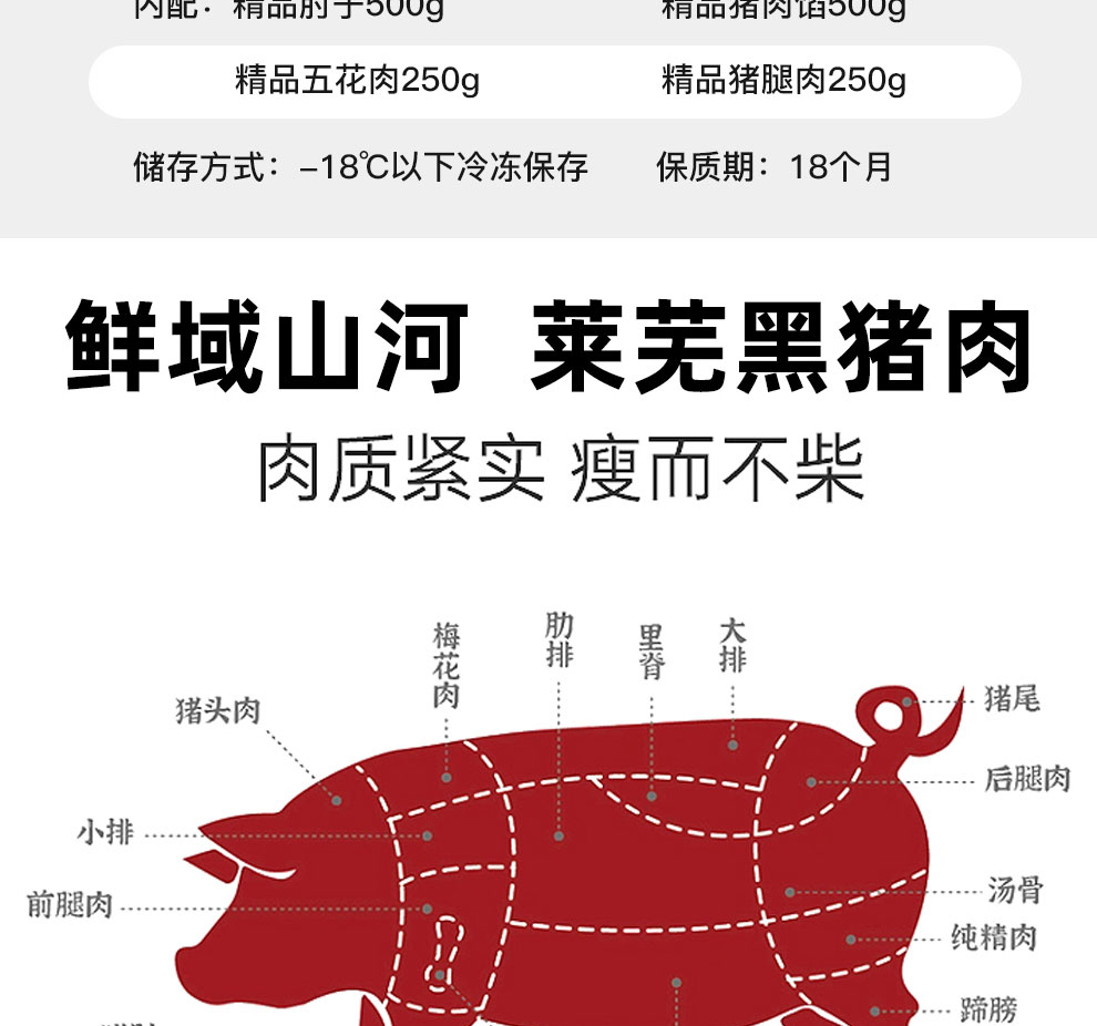 商品名称:(中合誉品)莱芜黑山猪肉礼盒298型1500g 精品肘子500g+精品猪肉馅500g+精品五花肉250g+精品猪腿肉250g 大自然散养黑猪 肉质紧实 瘦而不柴
