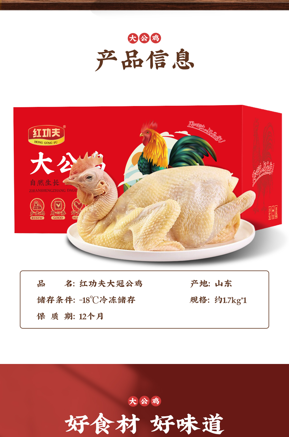商品名称:(中合誉品)红功夫泰山大冠公鸡A款 1.7kg 大冠公鸡 品味鲜香