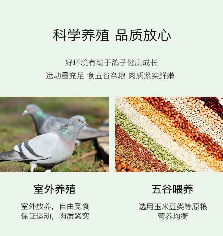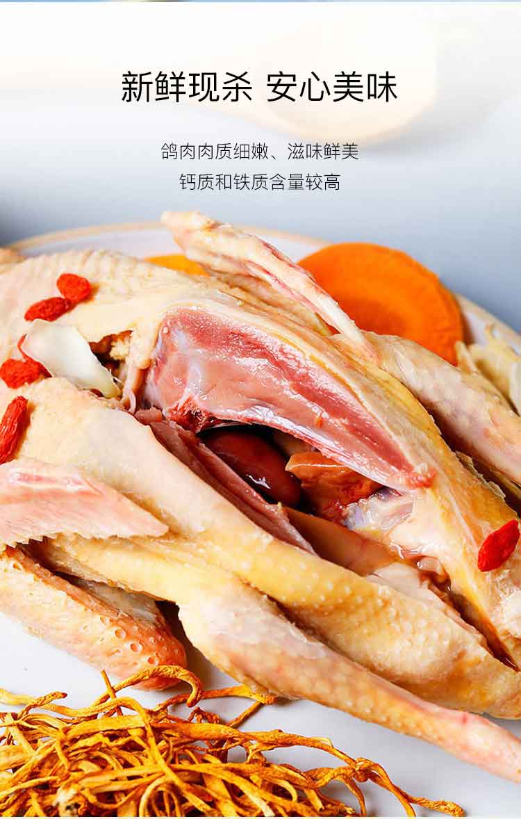 商品名称:(世星阳光)+泓花会 生鲜谷物散养新鲜鸽子 350克*4只 送4只参+4包料 谷饲散养 零激零抗 肉质更嫩滑 汤醇营养更丰富