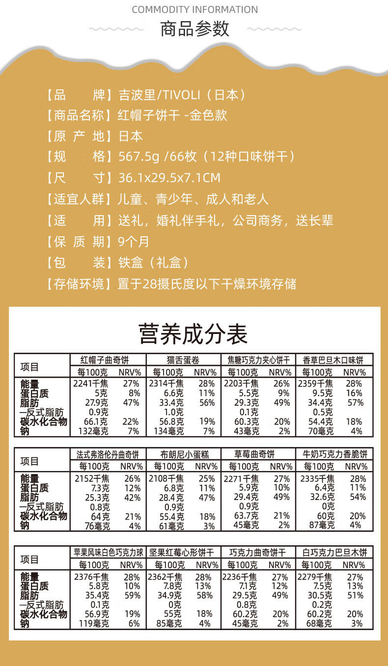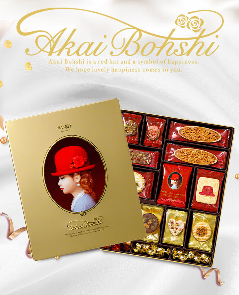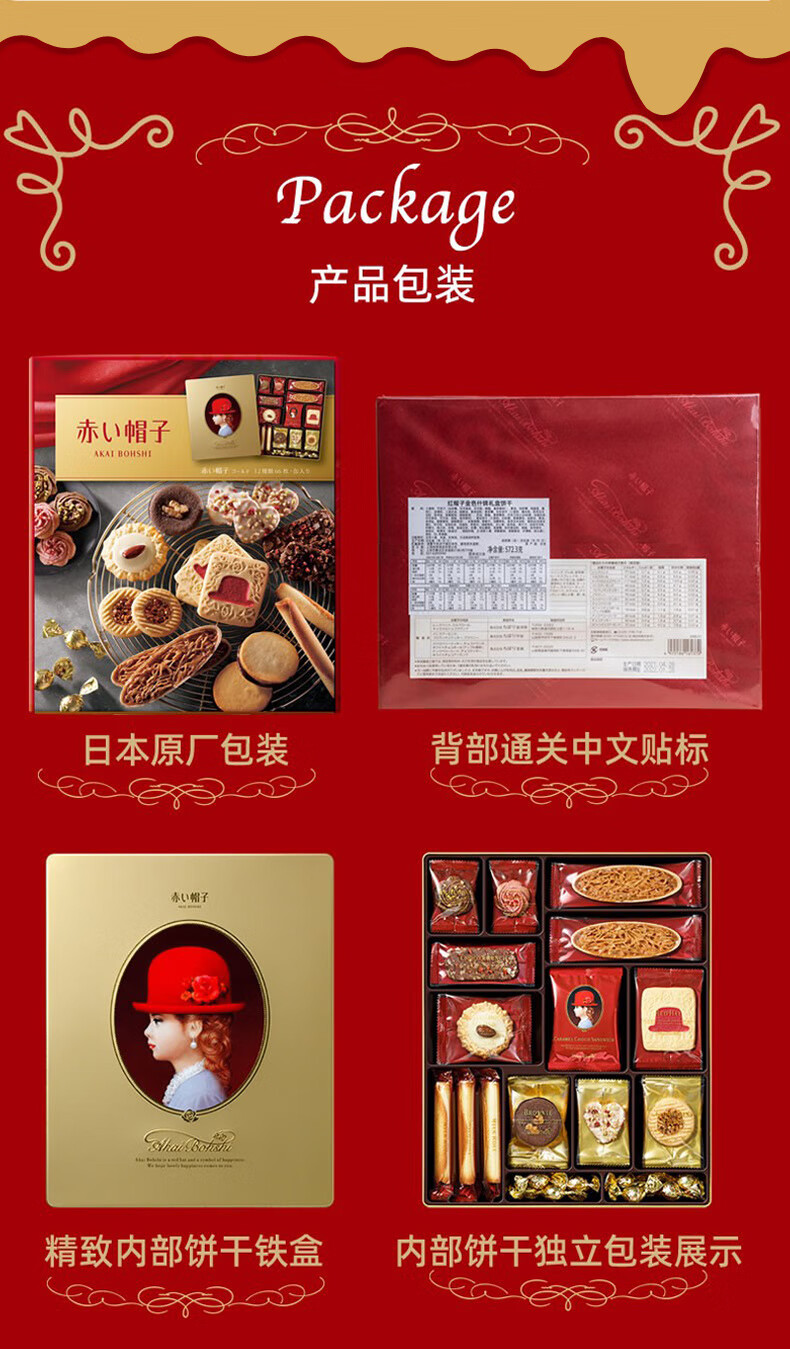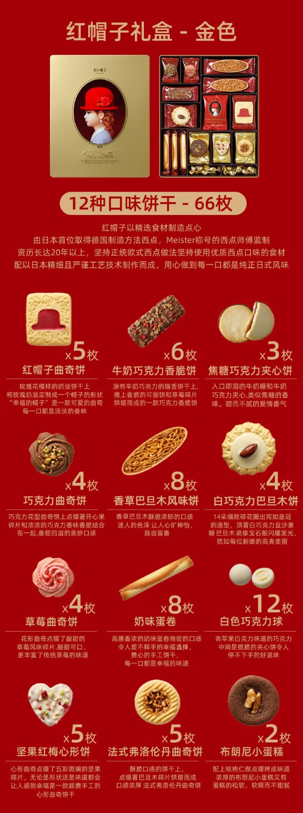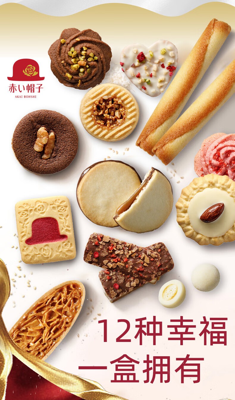 (超运·禾贸)红帽子什锦饼干礼盒(45枚)388.2g(12种口味包含: 红帽子曲奇饼3枚 猫舌蛋卷6枚 焦糖巧克力夹心饼干2枚 香草巴旦木口味饼3枚 法式弗洛伦丹曲奇饼4枚 布朗尼小蛋糕2枚 草莓曲奇饼3枚 牛奶巧克力香脆饼4枚 苹果