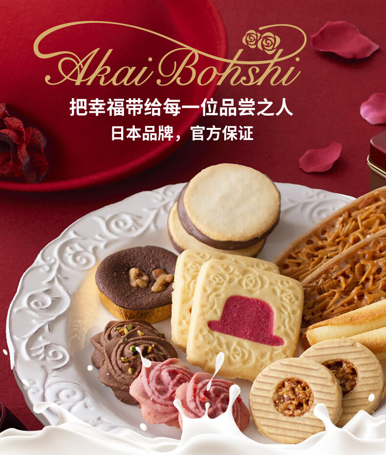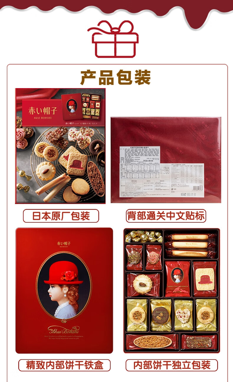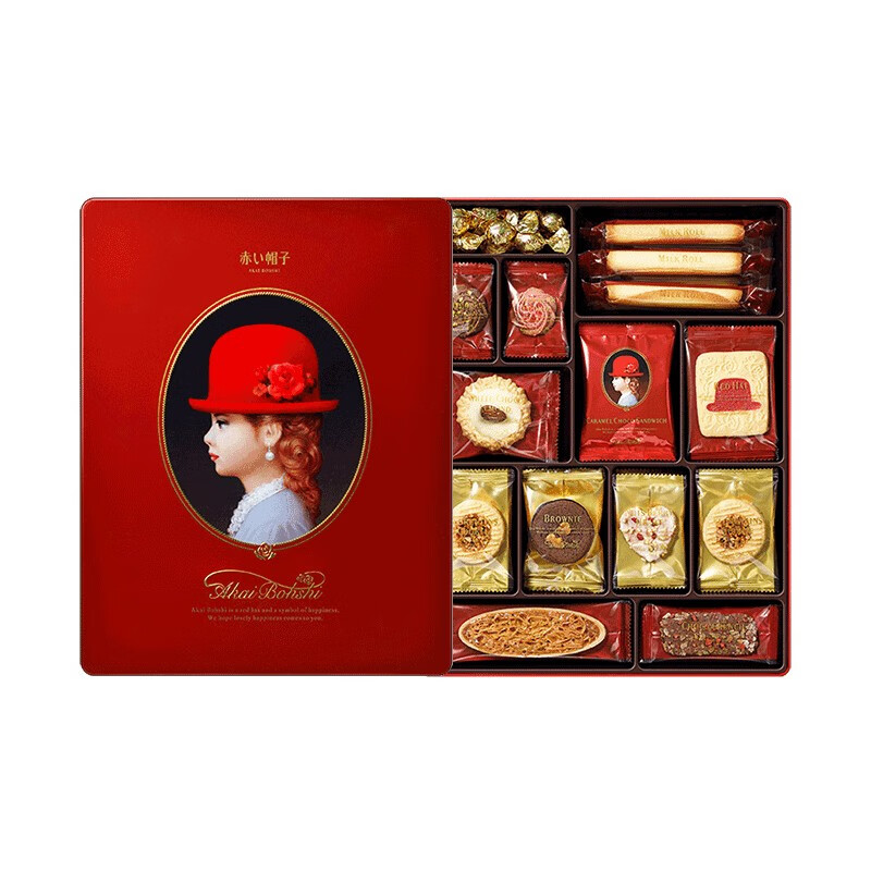 (超运·禾贸)红帽子什锦饼干礼盒(45枚)388.2g(12种口味包含: 红帽子曲奇饼3枚 猫舌蛋卷6枚 焦糖巧克力夹心饼干2枚 香草巴旦木口味饼3枚 法式弗洛伦丹曲奇饼4枚 布朗尼小蛋糕2枚 草莓曲奇饼3枚 牛奶巧克力香脆饼4枚 苹果