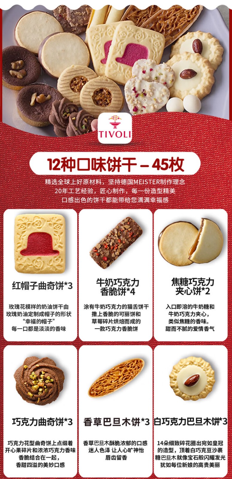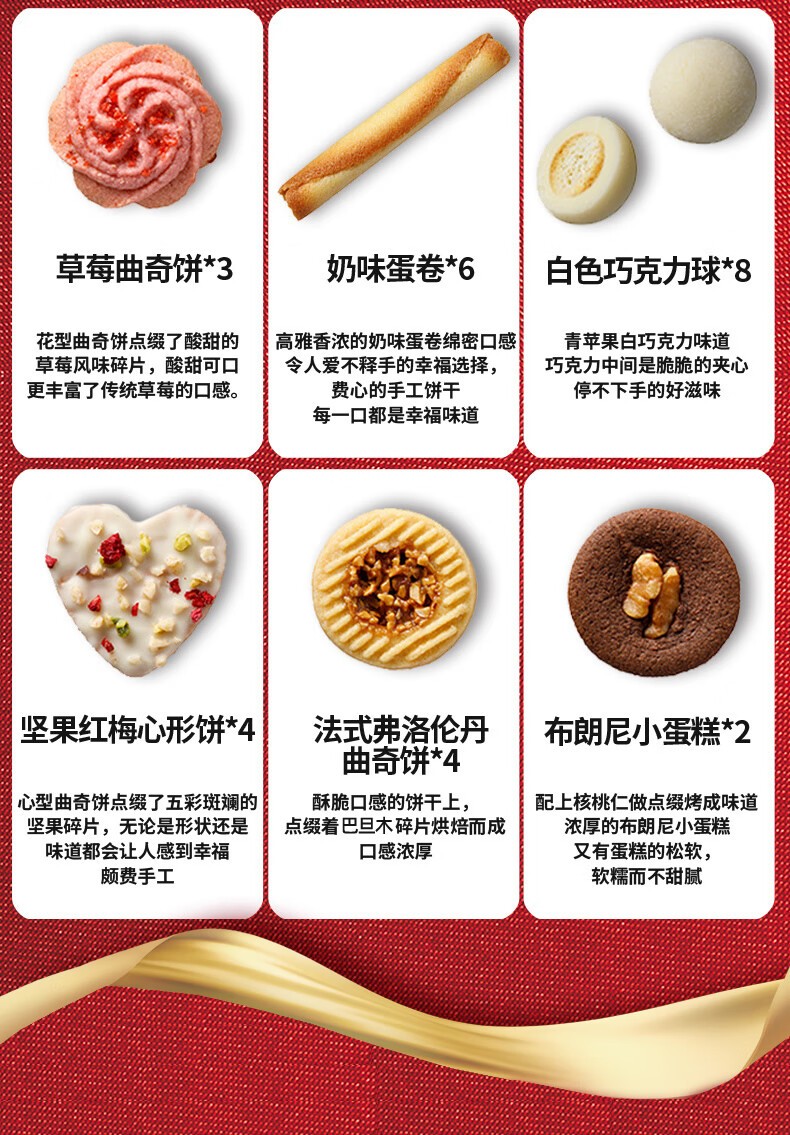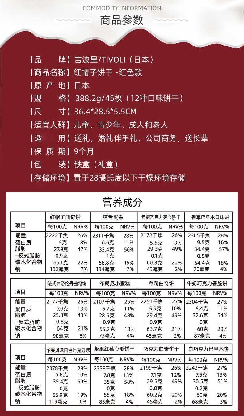 商品名称:(超运·禾贸)红帽子什锦饼干礼盒(45枚)388.2g(12种口味包含: 红帽子曲奇饼3枚 猫舌蛋卷6枚 焦糖巧克力夹心饼干2枚 香草巴旦木口味饼3枚 法式弗洛伦丹曲奇饼4枚 布朗尼小蛋糕2枚 草莓曲奇饼3枚 牛奶巧克力香脆饼4枚 苹果