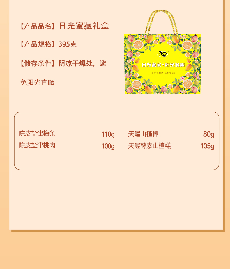 商品名称:(世星阳光)天喔 日光蜜藏•阳光慢酿礼盒395g 丰富的零食好吃在于好细节 精致包装送礼倍有面