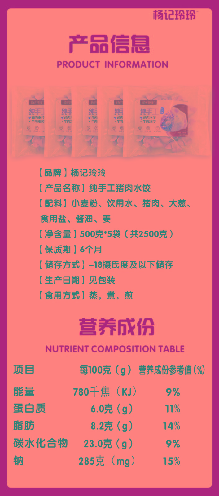 商品名称:(世星阳光) 杨记玲玲 手工水饺 猪肉水饺 5袋2500g 简装 纯手工水饺 食材新鲜 无添加