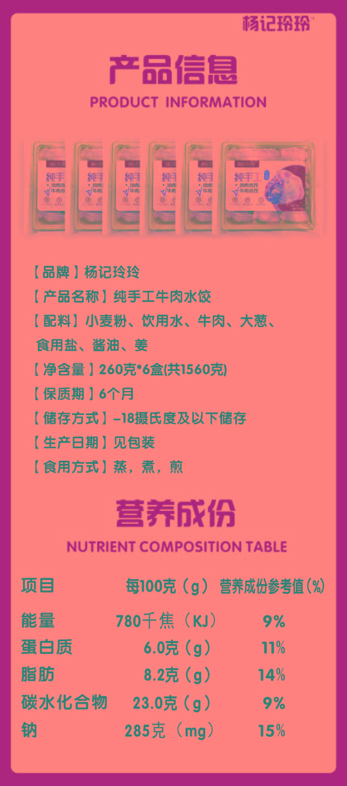 商品名称:(世星阳光) 杨记玲玲 手工水饺 牛肉水饺 6盒1560g(15个盒)盒装 纯手工水饺 食材新鲜 无添加