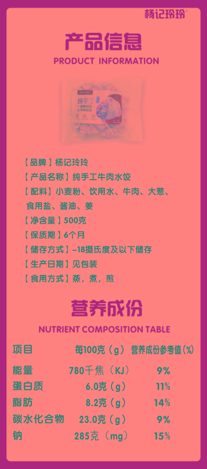 商品名称:(世星阳光) 杨记玲玲 手工水饺 牛肉水饺(尝鲜款)1袋500g 简装 纯手工水饺 食材新鲜 无添加