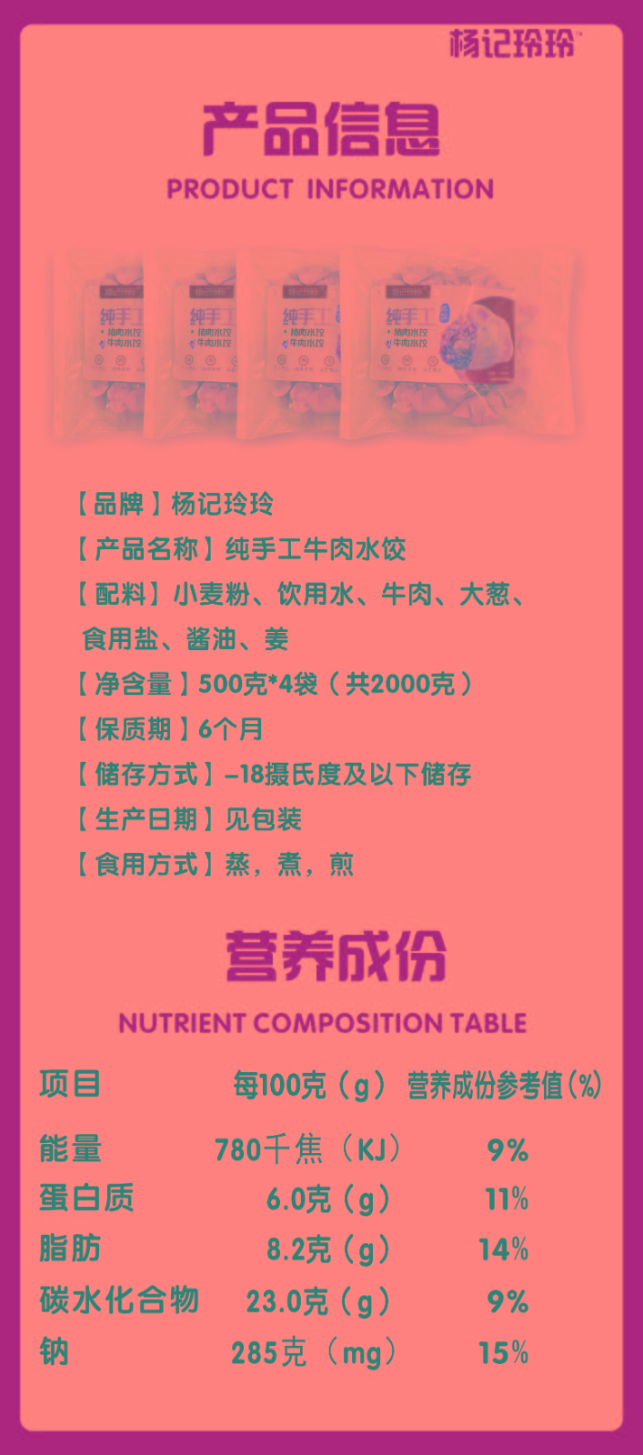 商品名称:(世星阳光) 杨记玲玲 手工水饺 牛肉水饺 4袋2000g 简装 纯手工水饺 食材新鲜 无添加